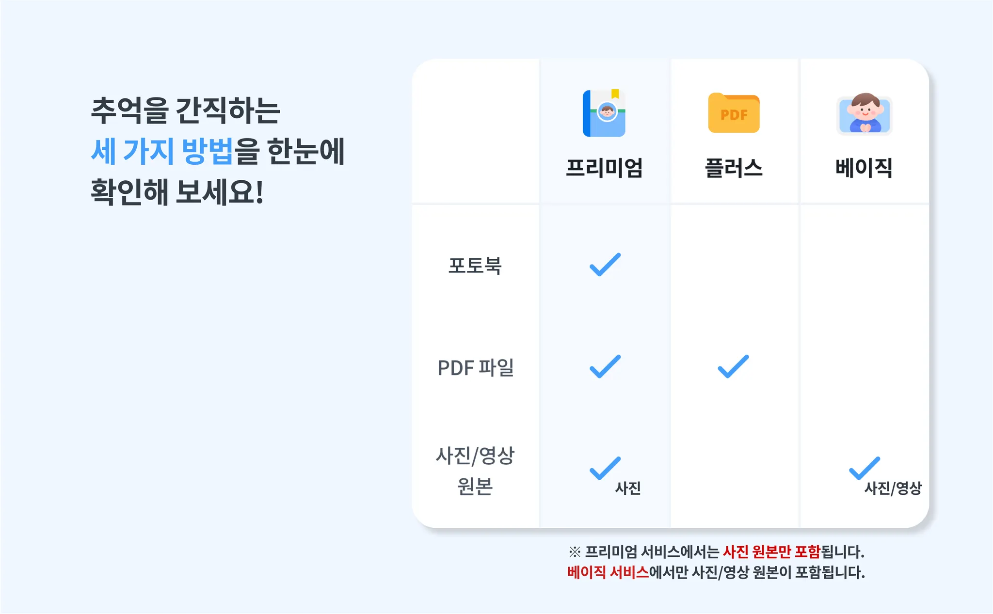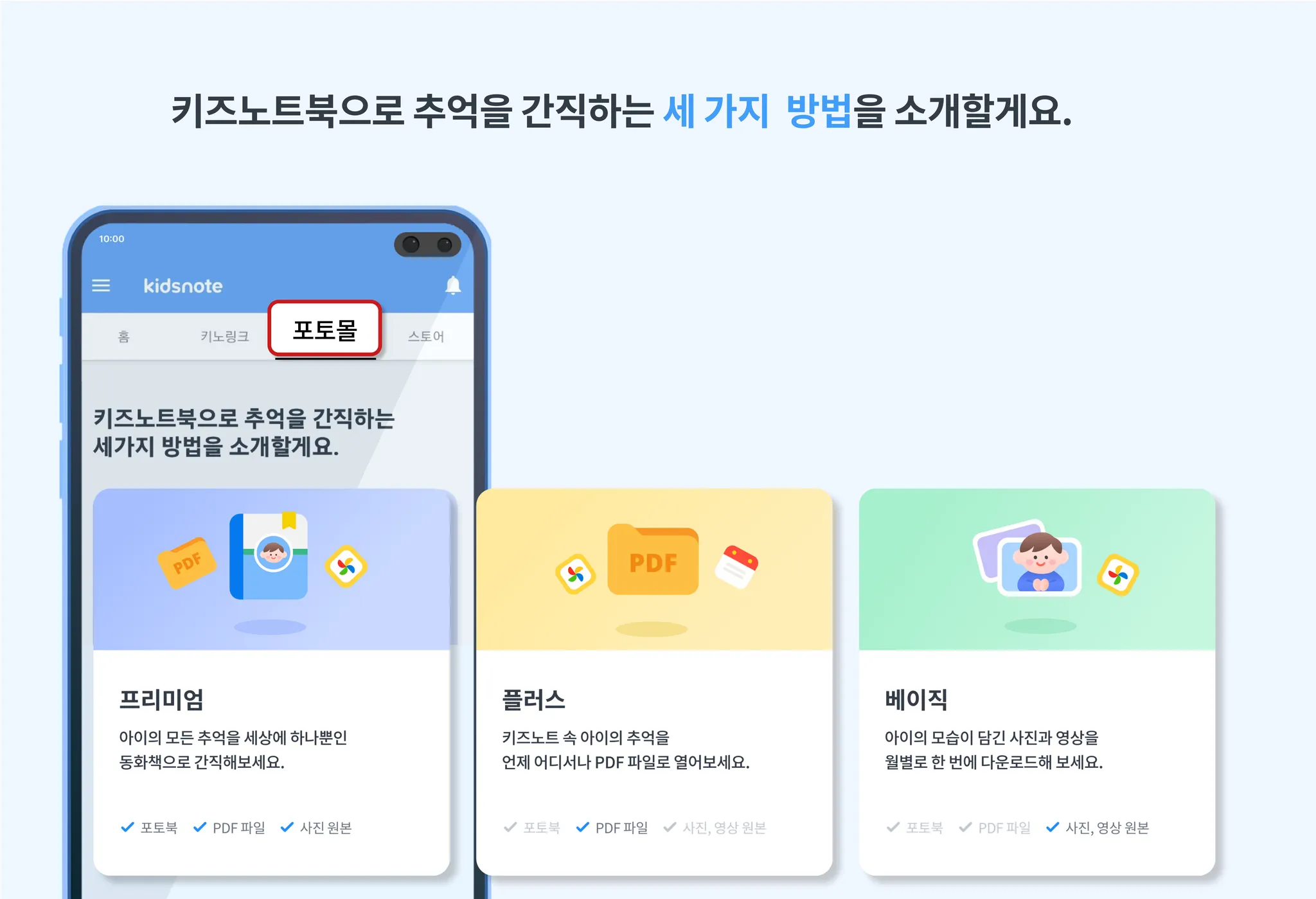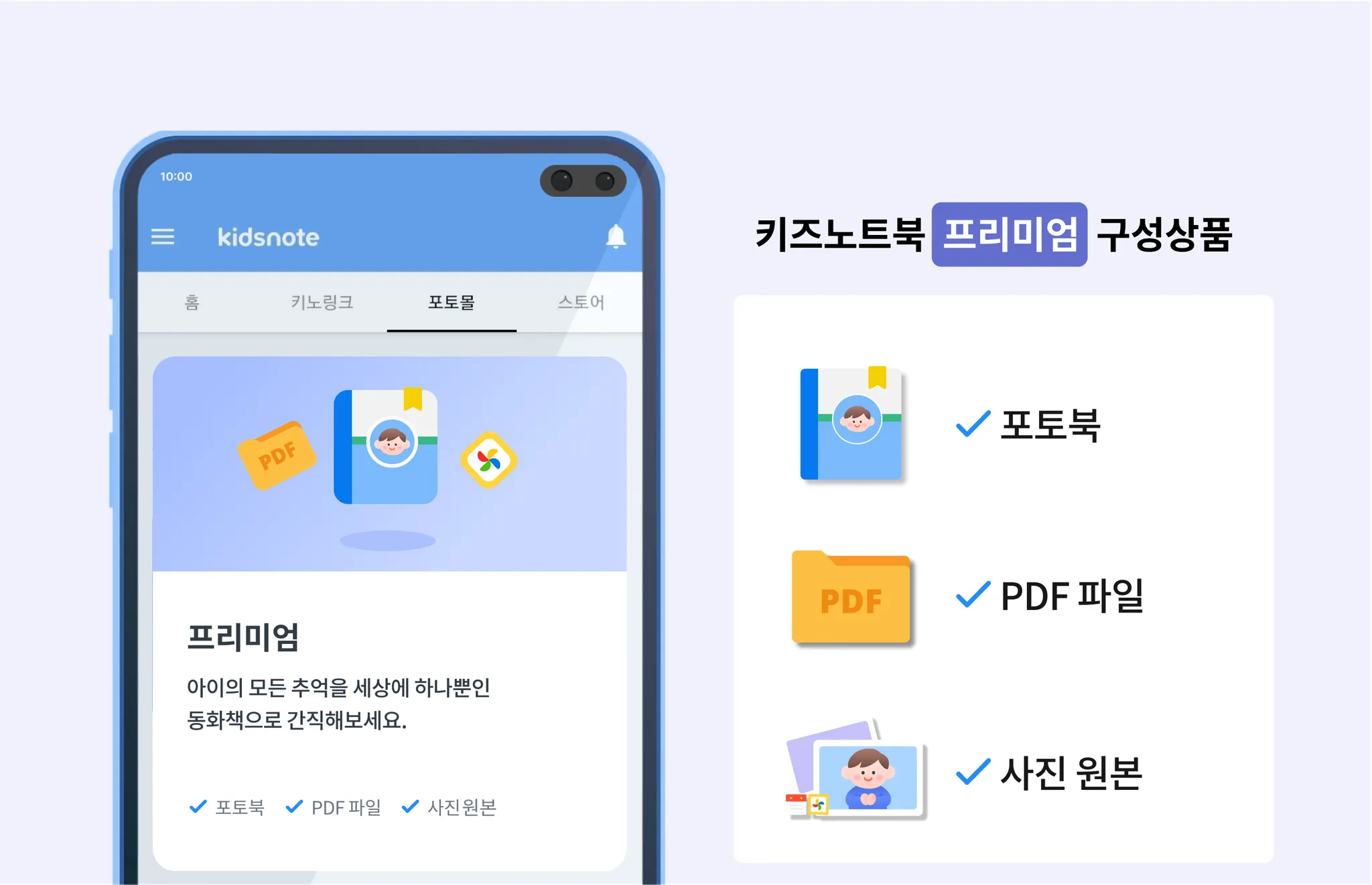 키즈노트북 프리미엄 서비스는 키즈노트 알림장과 앨범에 있는 우리 아이의 사진과 영상을 포토북, PDF 파일, 사진 원본 파일로 간직할 수 있는 서비스 입니다.