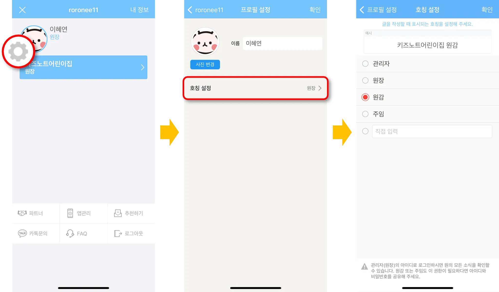 앱 > 좌측 상단 아이콘 선택 > 톱니바퀴 아이콘 > 호칭