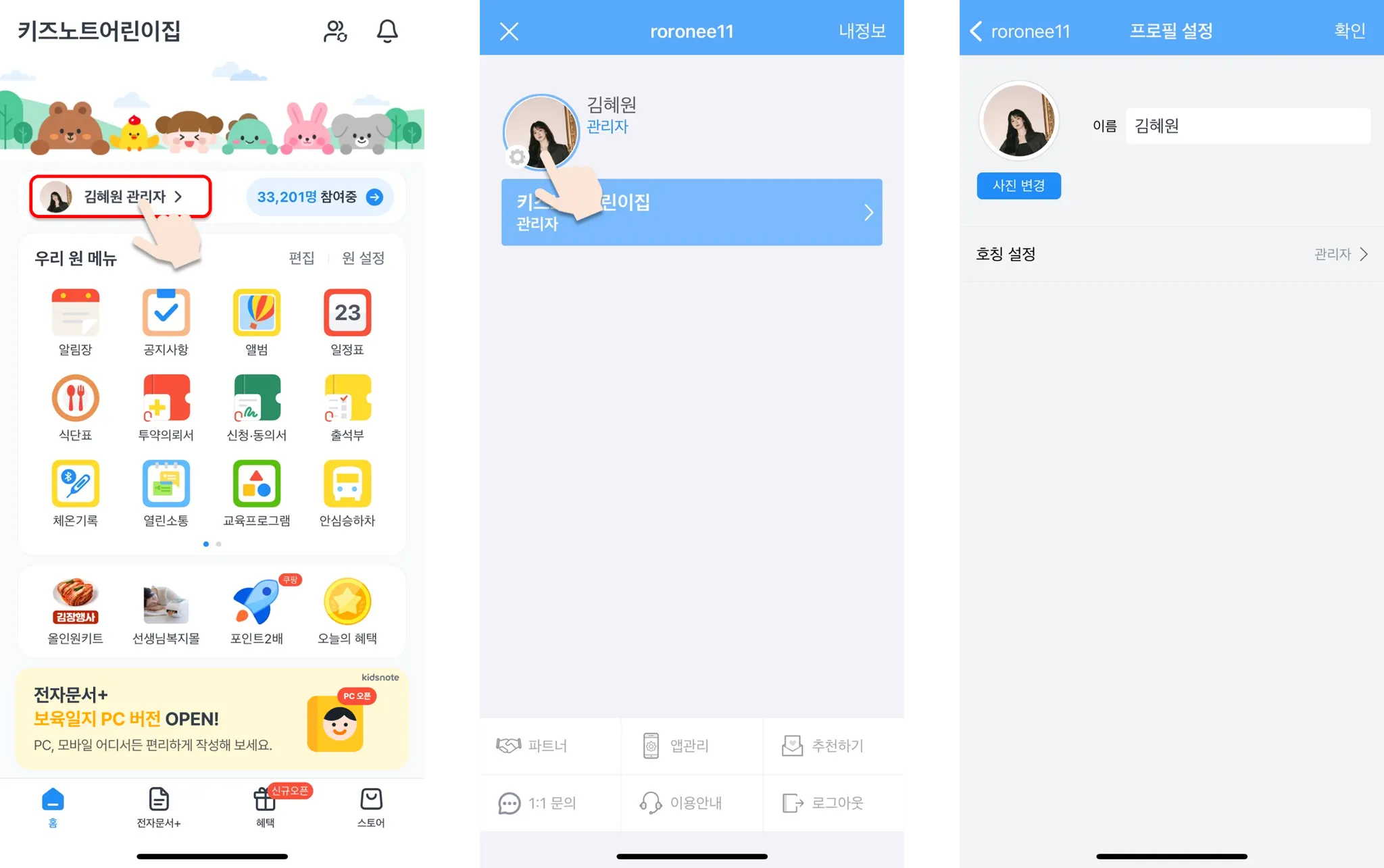 내 프로필 변경을 원하는 경우 키즈노트 메인 화면에서 내 프로필 영역을 선택해주세요. 상세 페이지에서 이름,호칭,사진을 수정할 수 있습니다.