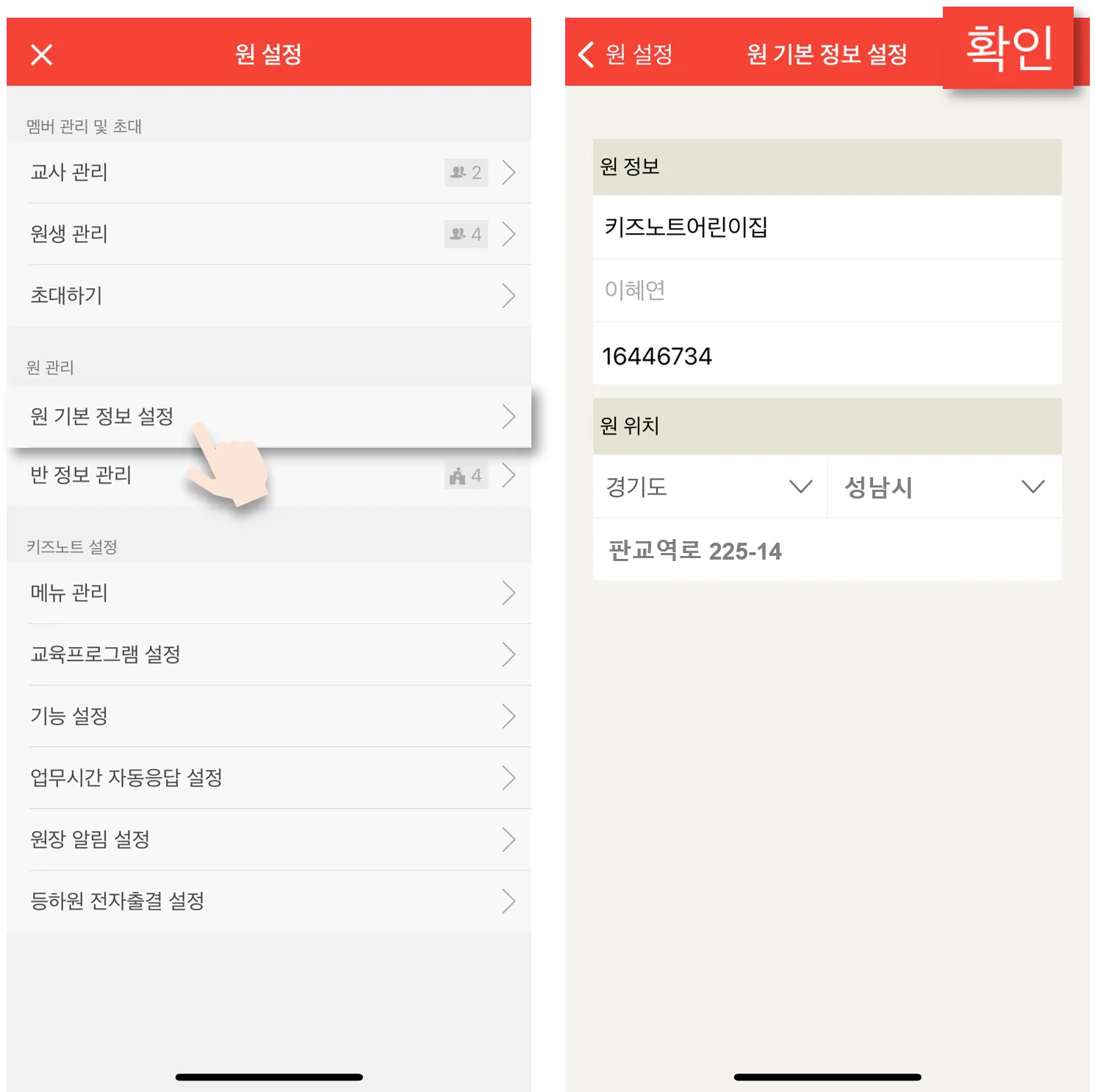 원 설정에서 원 기본 정보 설정을 선택해주세요. 등록된 원의 이름, 원 대표 전화번호, 주소를 확인하고 필요시 수정할 수 있습니다.