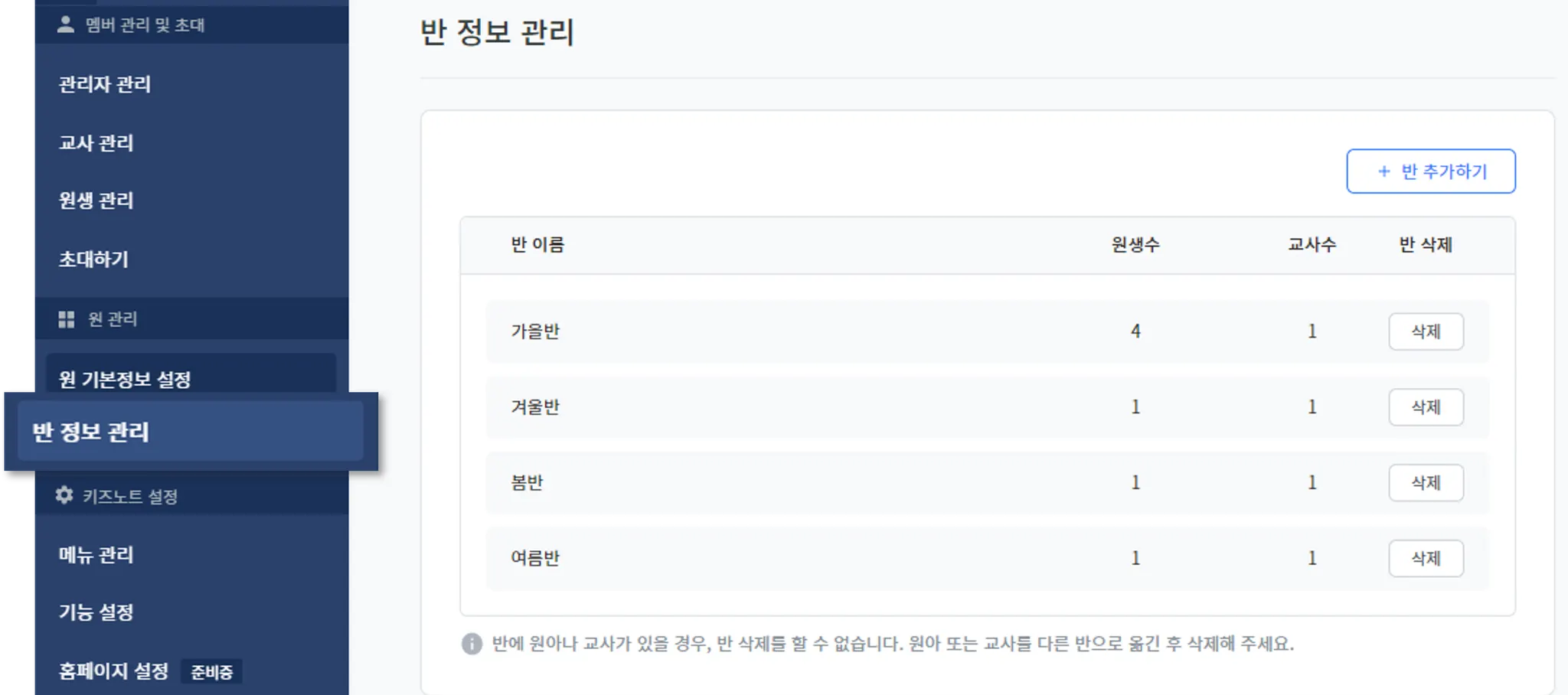 반 정보 관리를 선택하면, 반 별 원생 수, 교사 수를 확인하고 반을 추가하거나 삭제할 수 있습니다.