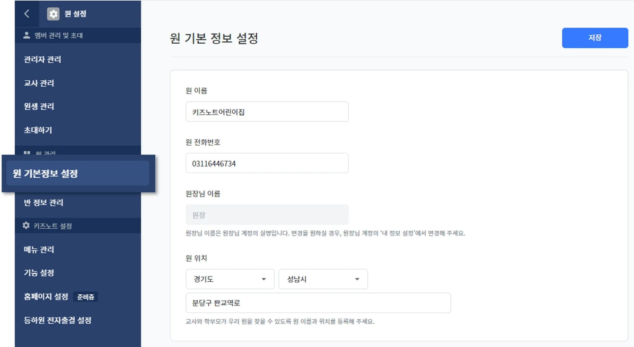 원 설정 메뉴에서 원 기본 정보 설정 메뉴를 선택해 주세요. 우리 원의 이름과 원 대표 전화번호, 주소를 확인 후 필요 시 변경할 수 있습니다.