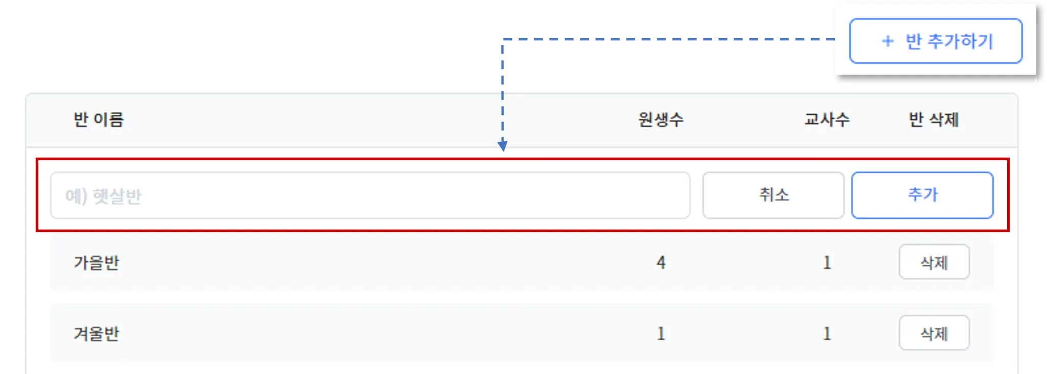 반 정보 관리에서 + 반 추가하기를 선택하면, 반 이름을 입력 후 추가할 수 있습니다.