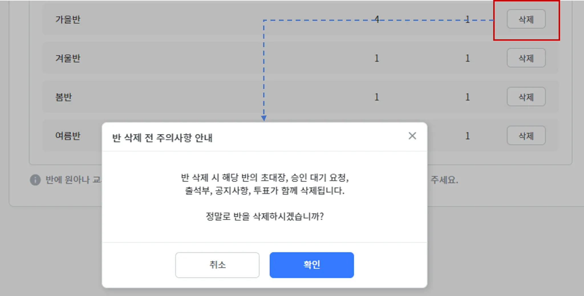 반 삭제 시 해당 반의 초대장, 승인 대기 요청, 출석부, 공지사항, 투표가 함께 삭제됩니다. 삭제 전 꼭 주의해주세요.