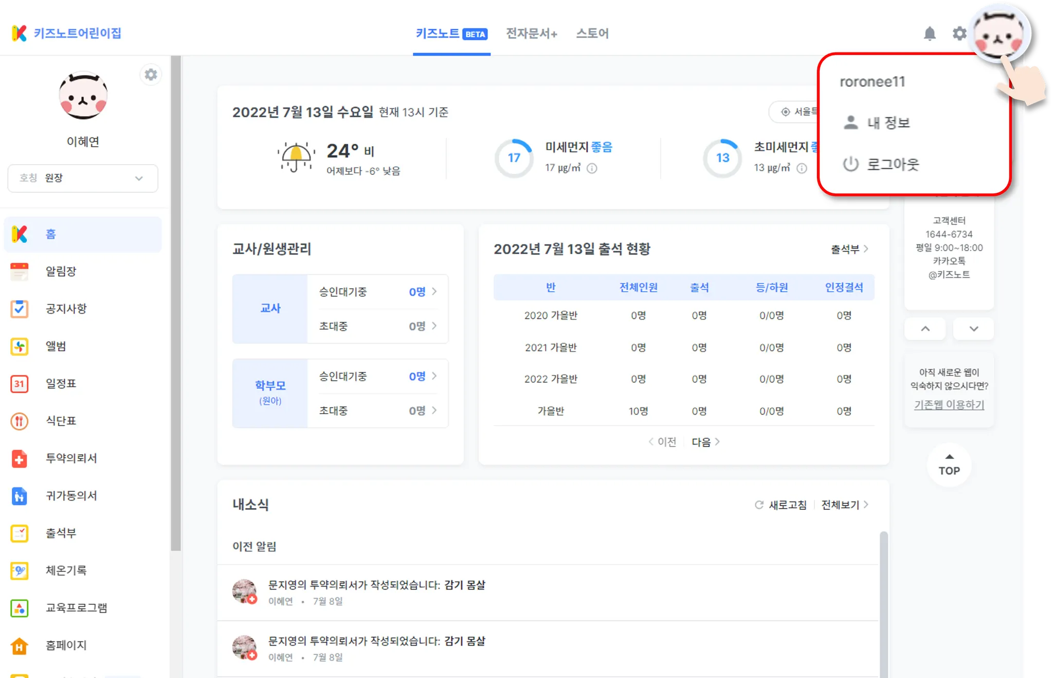 원장님 이름 변경은 우측 사용자 이름 클릭 > 내 정보 설정에서 변경이 가능합니다.