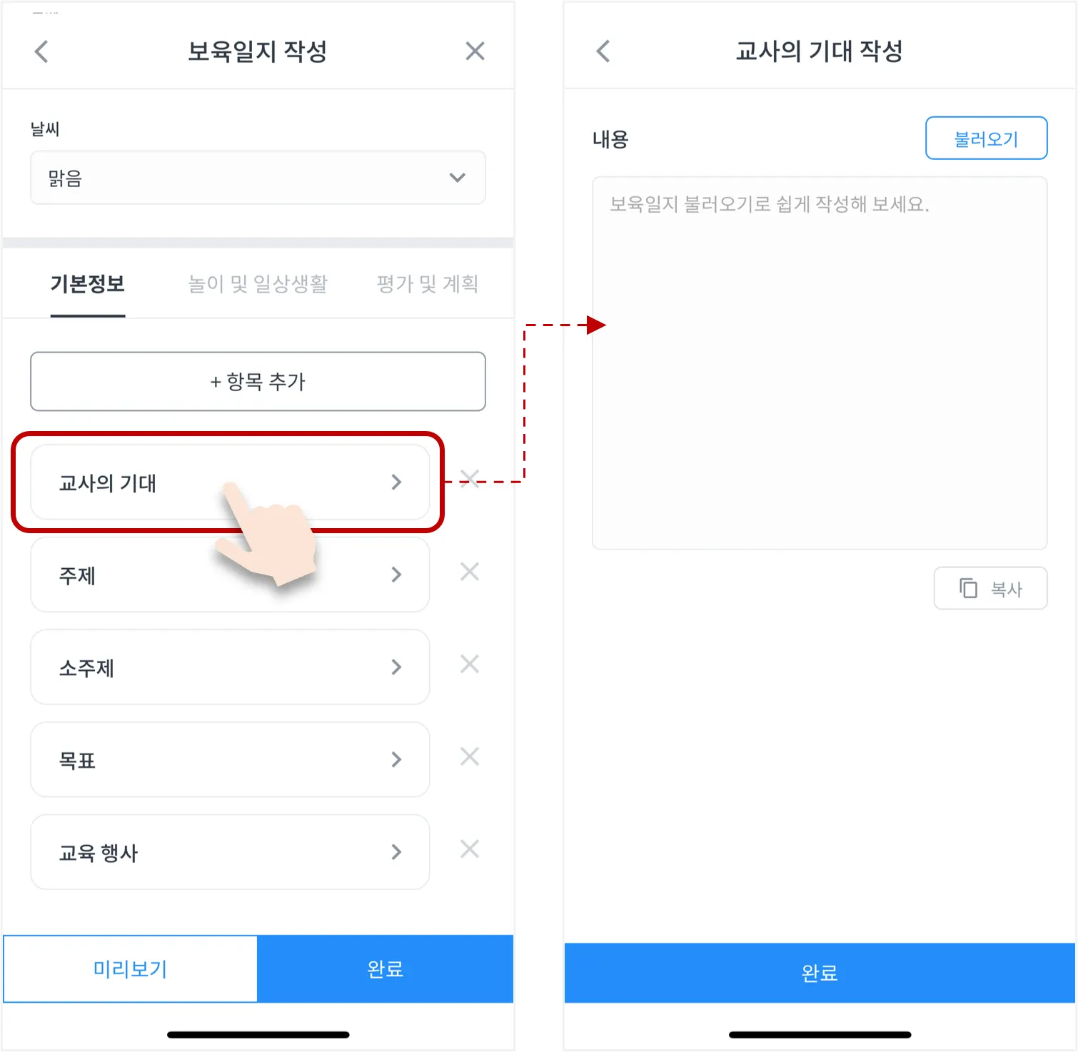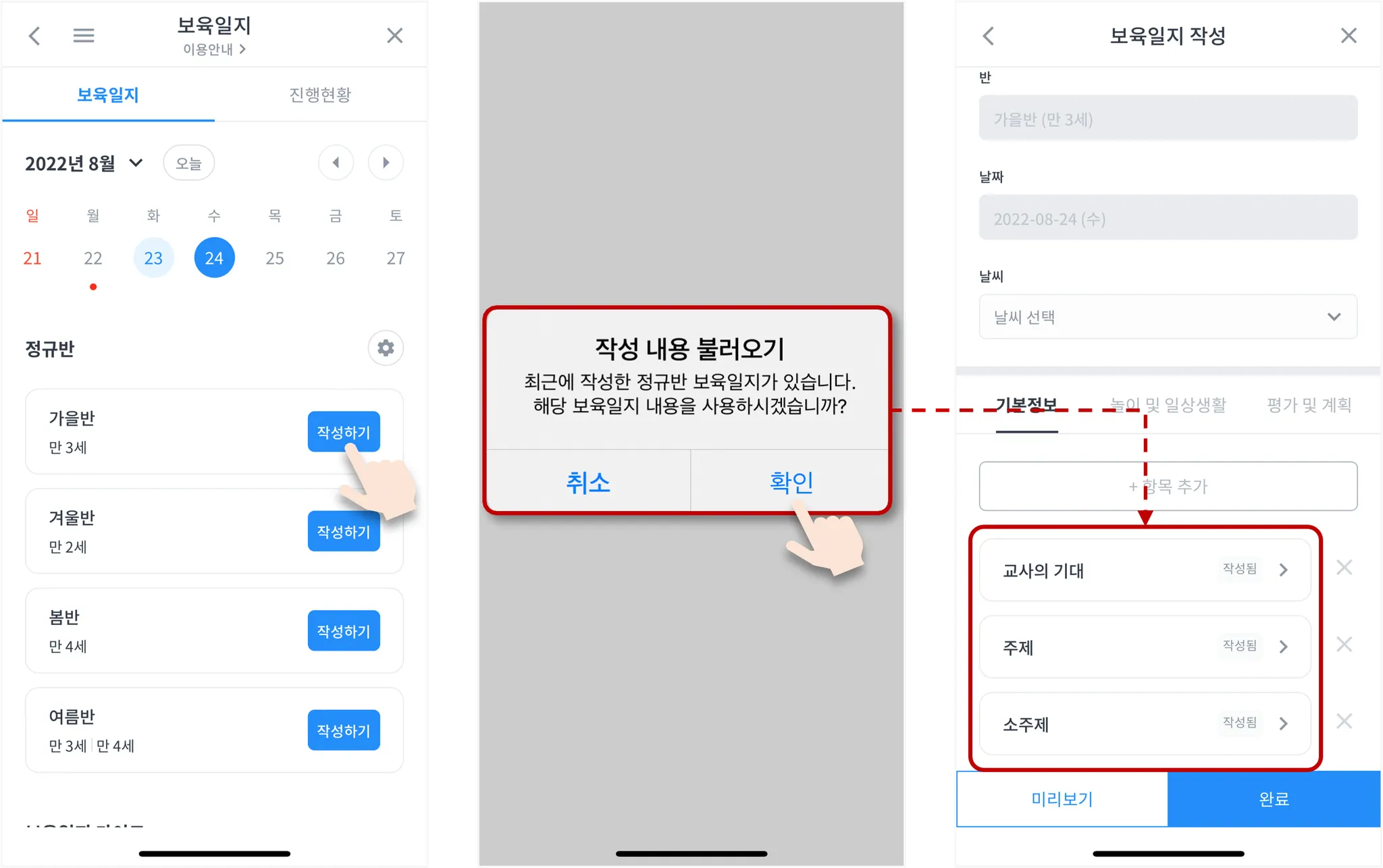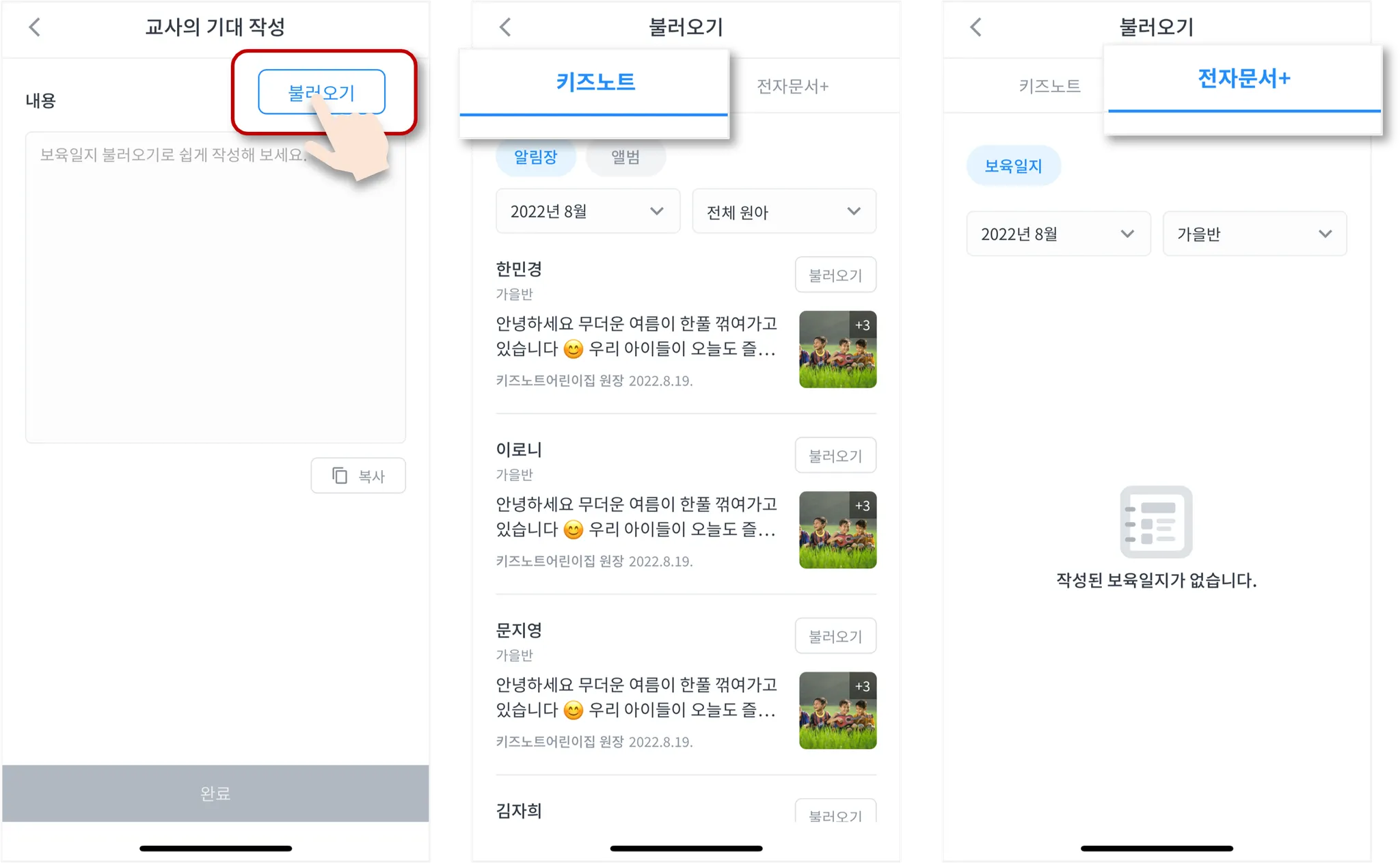 - 불러오기 기능으로 알림장, 앨범, 이전에 작성한 보육일지를 불러올 수 있습니다.