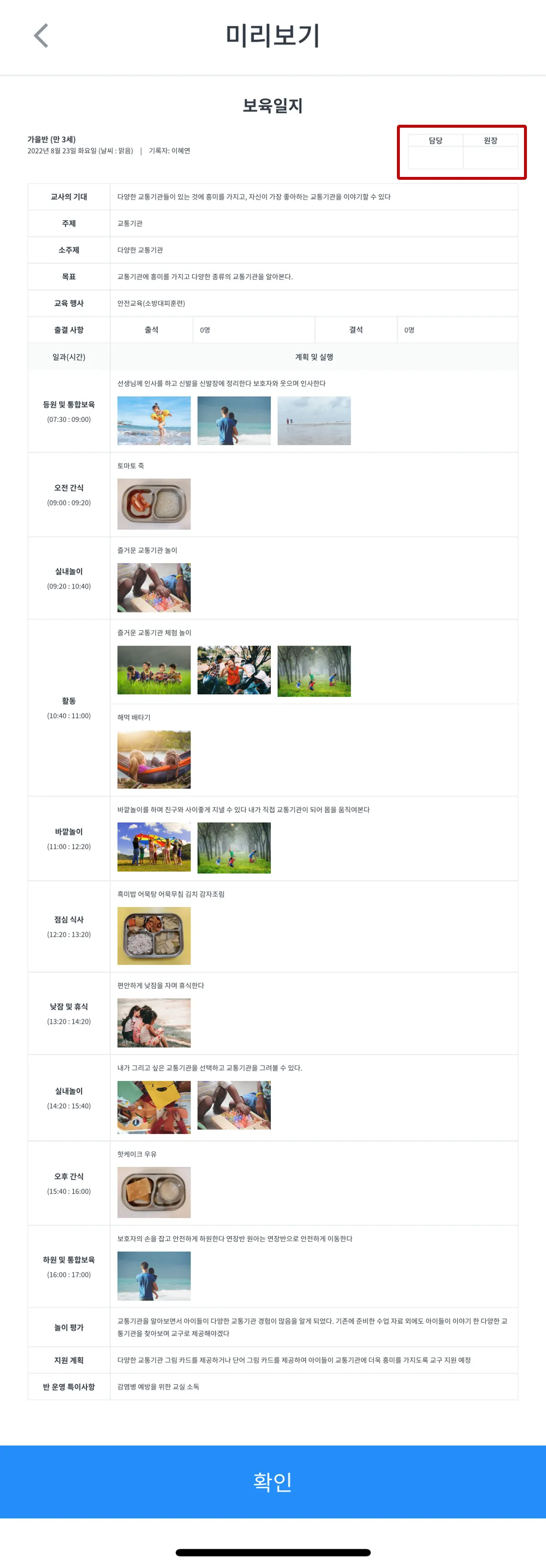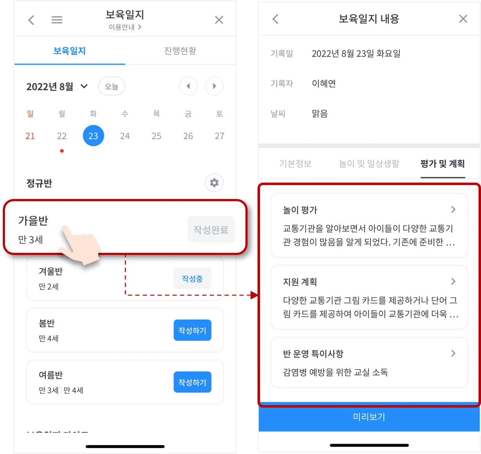 보육일지 내용을 모두 작성했다면 미리보기를 선택해보세요. 서식에 맞추어 내용이 자동 입력됩니다!
