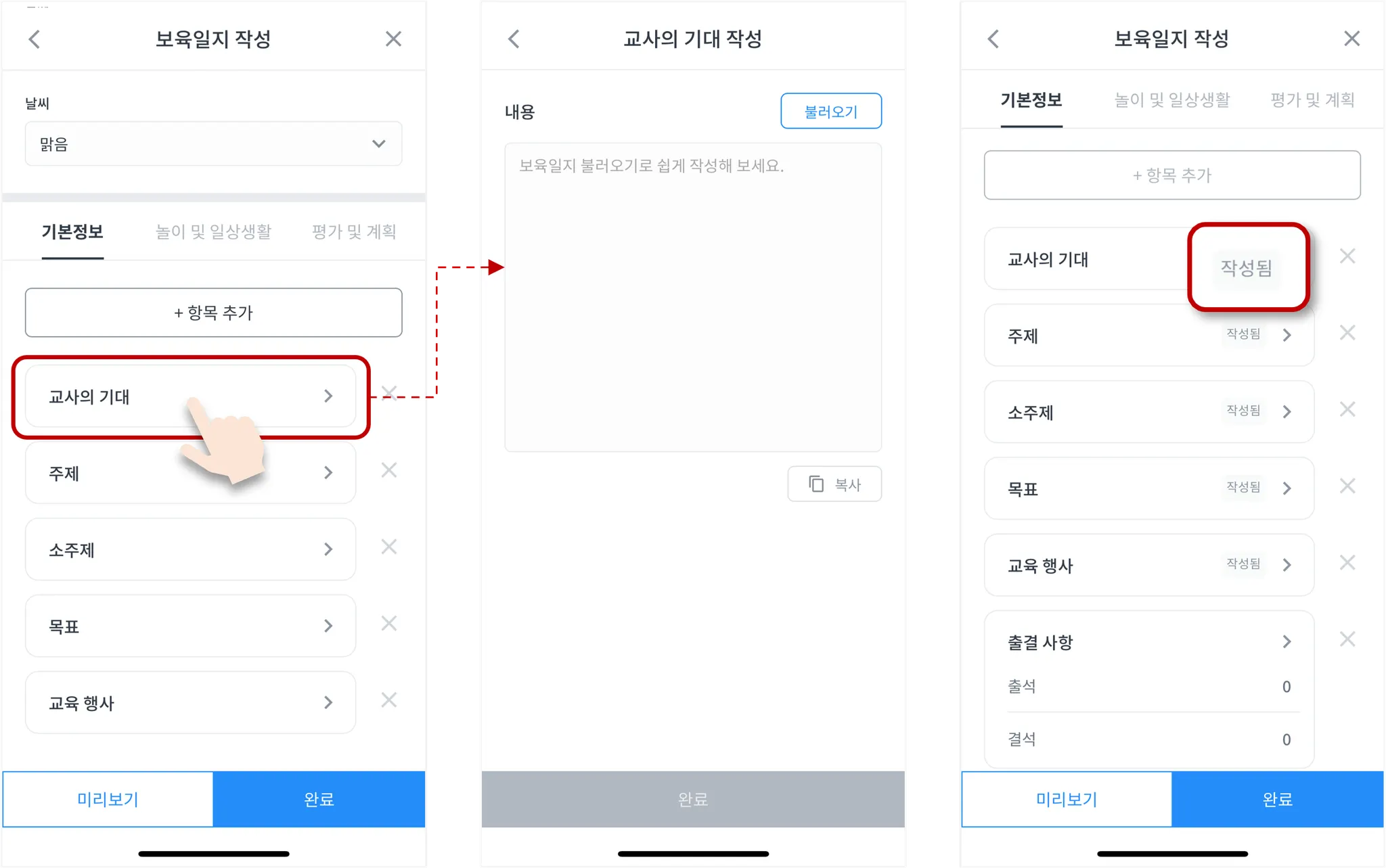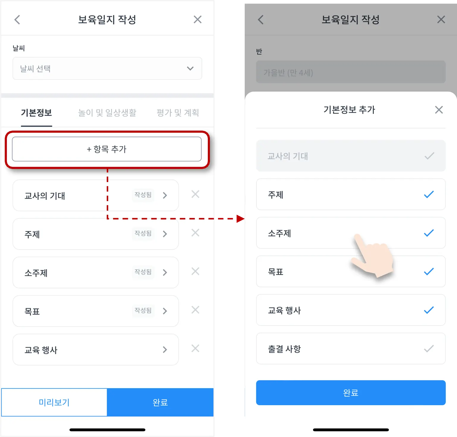 보육일지 기본정보 항목에서는 교사의 기대, 주제, 소주제, 목표, 교육행사, 출결정보를 선택할 수 있습니다.