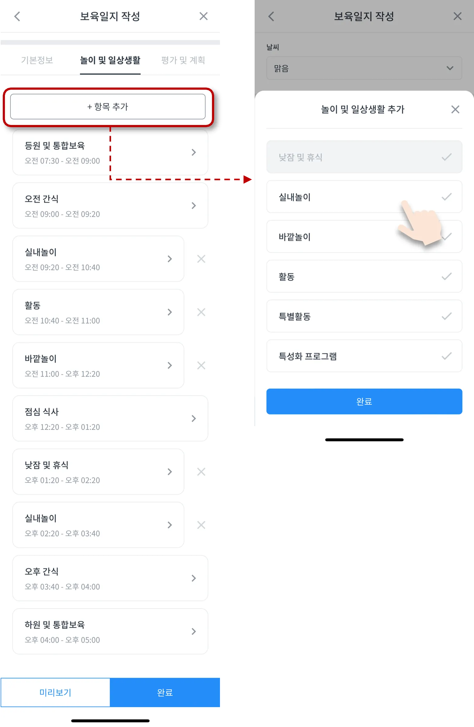 - 항목 추가를 선택하면 실내놀이, 바깥놀이, 활동, 특별활동, 특성화프로그램을 추가할 수 있습니다.