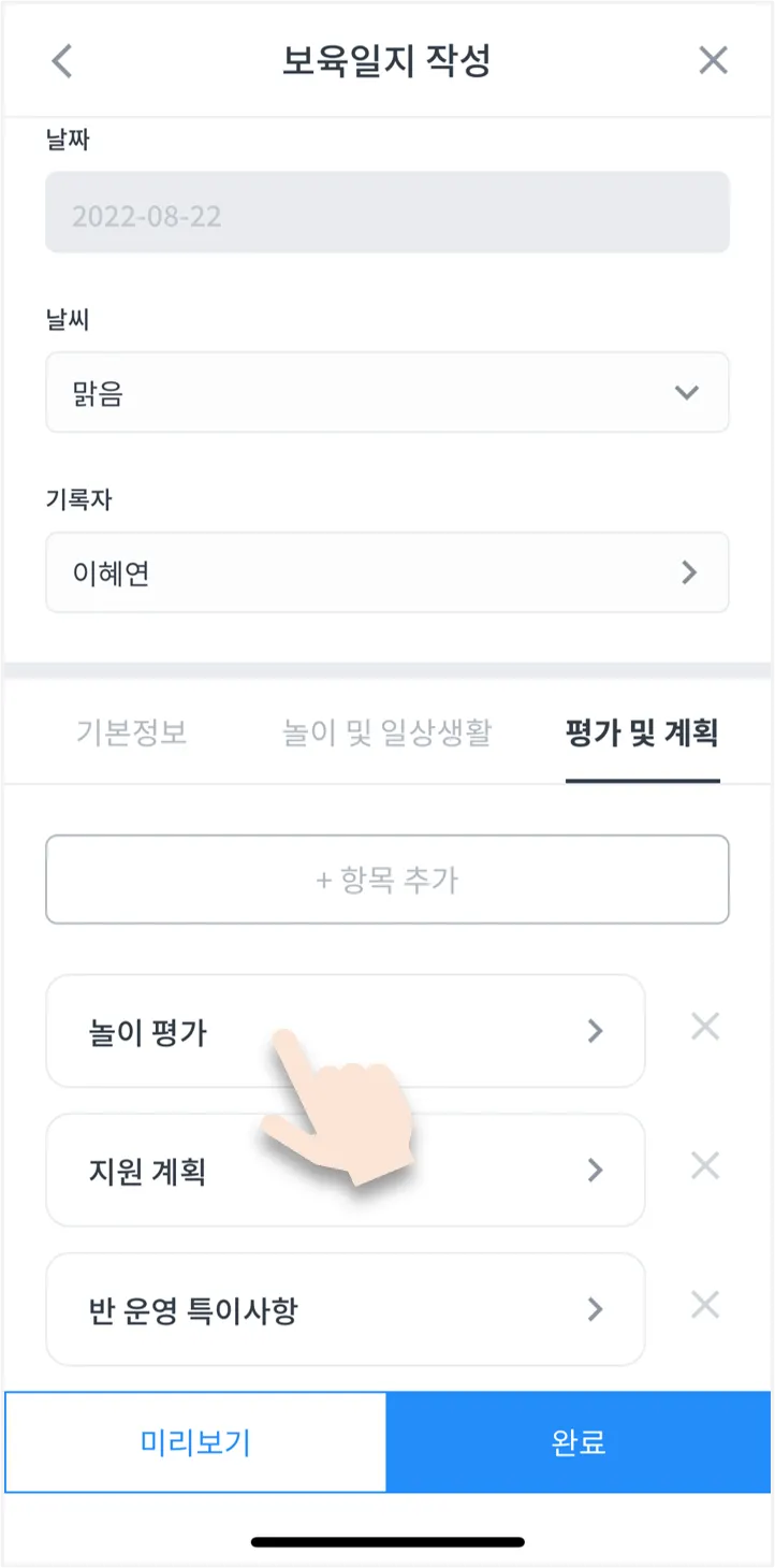 보육일지 평가 및 계획에서는 놀이평가, 지원 계획, 반 운영 특이사항 항목이 기본 노출됩니다.