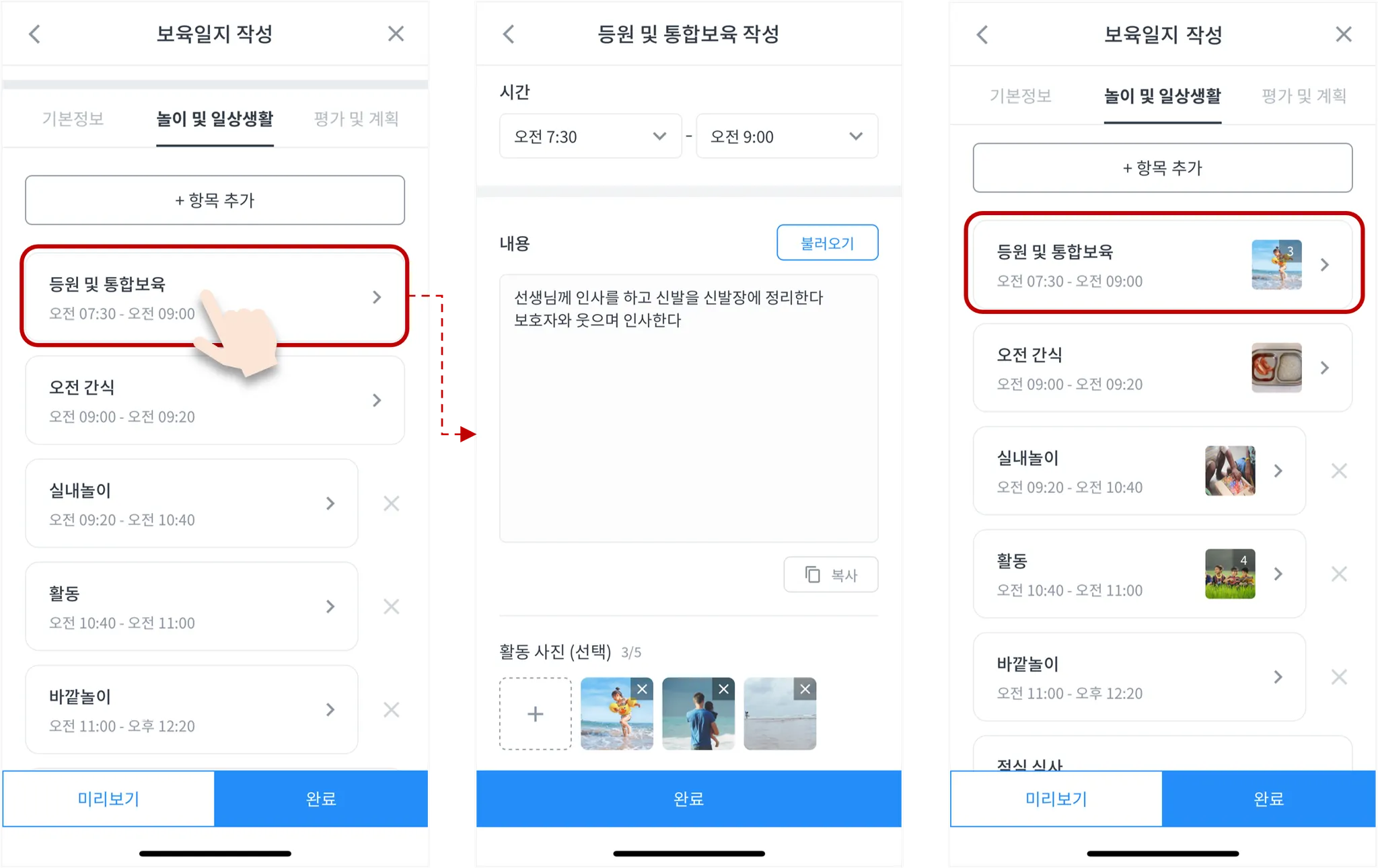 - 놀이 및 일상생활 항목은 사진을 추가할 수 있습니다. (최대 5장)