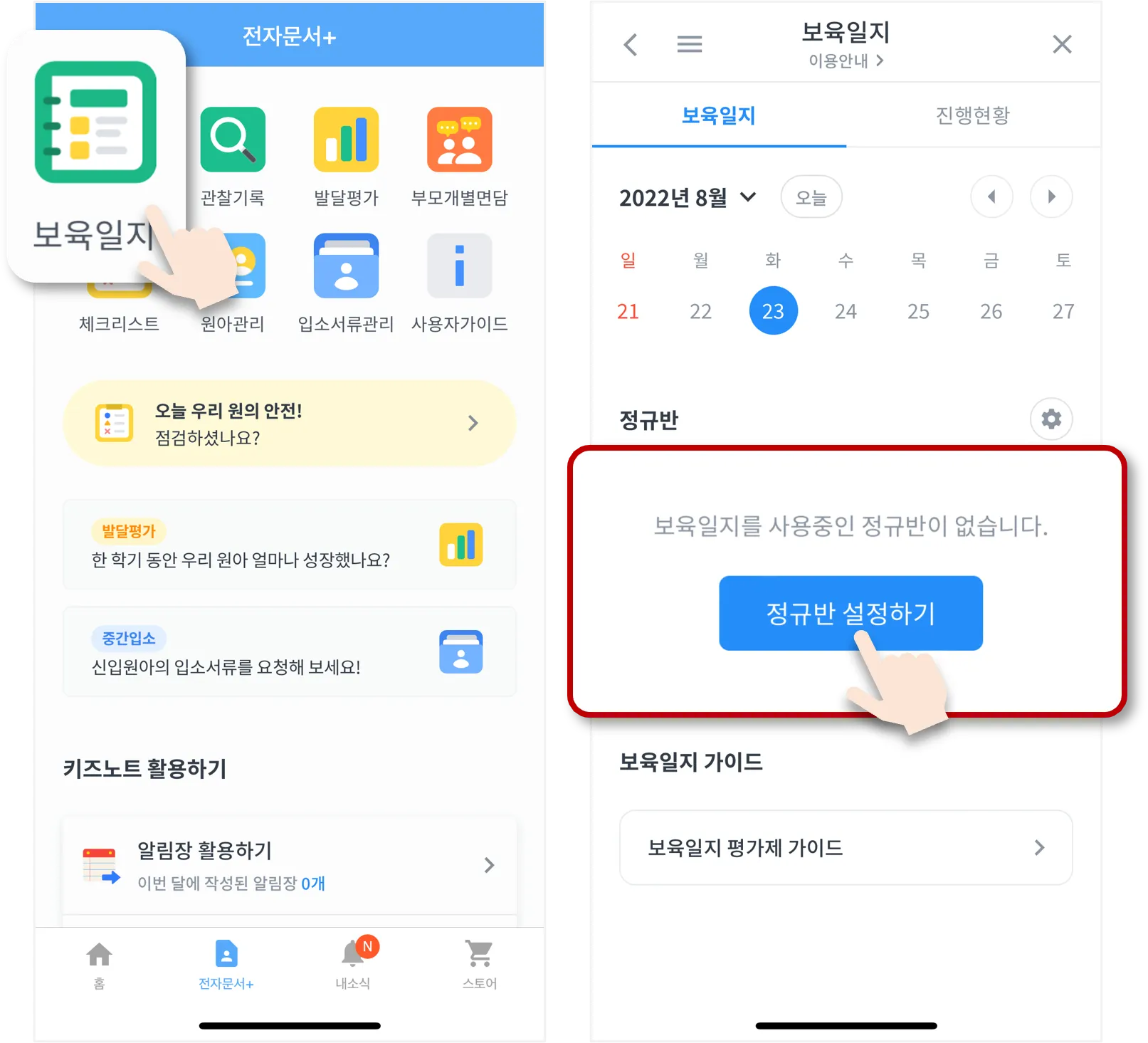 전자문서+에서 보육일지를 선택하고, 보육일지를 작성할 정규반을 설정해주세요.