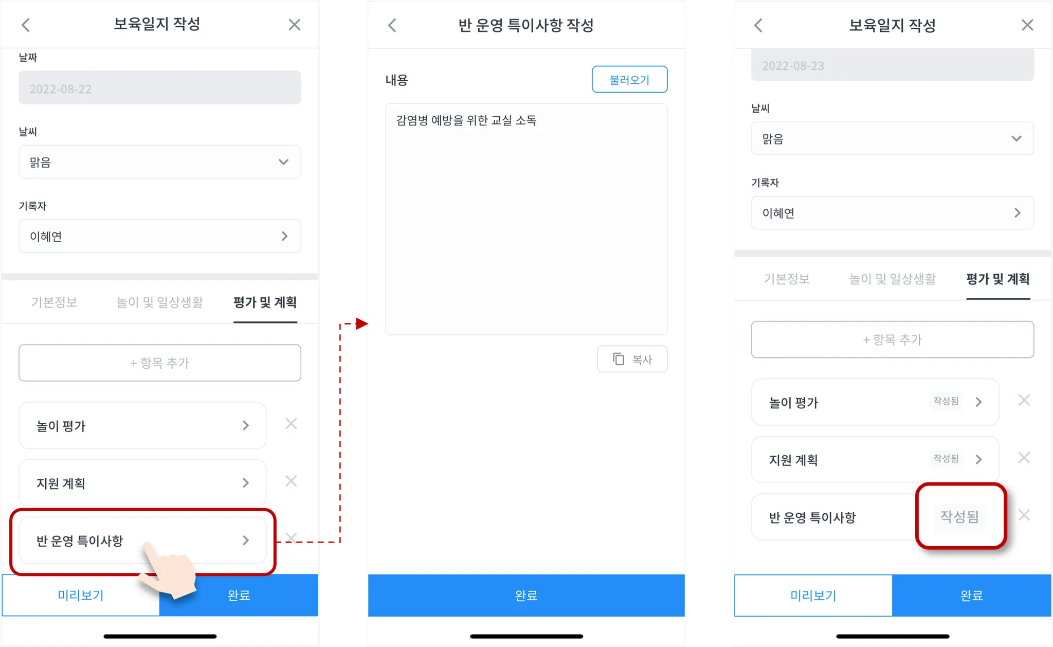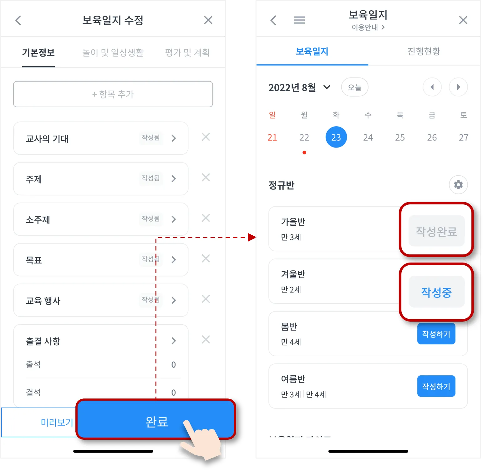 완료 버튼을 누르면 보육일지 홈 화면으로 이동하며, 작성 현황을 볼 수 있습니다.