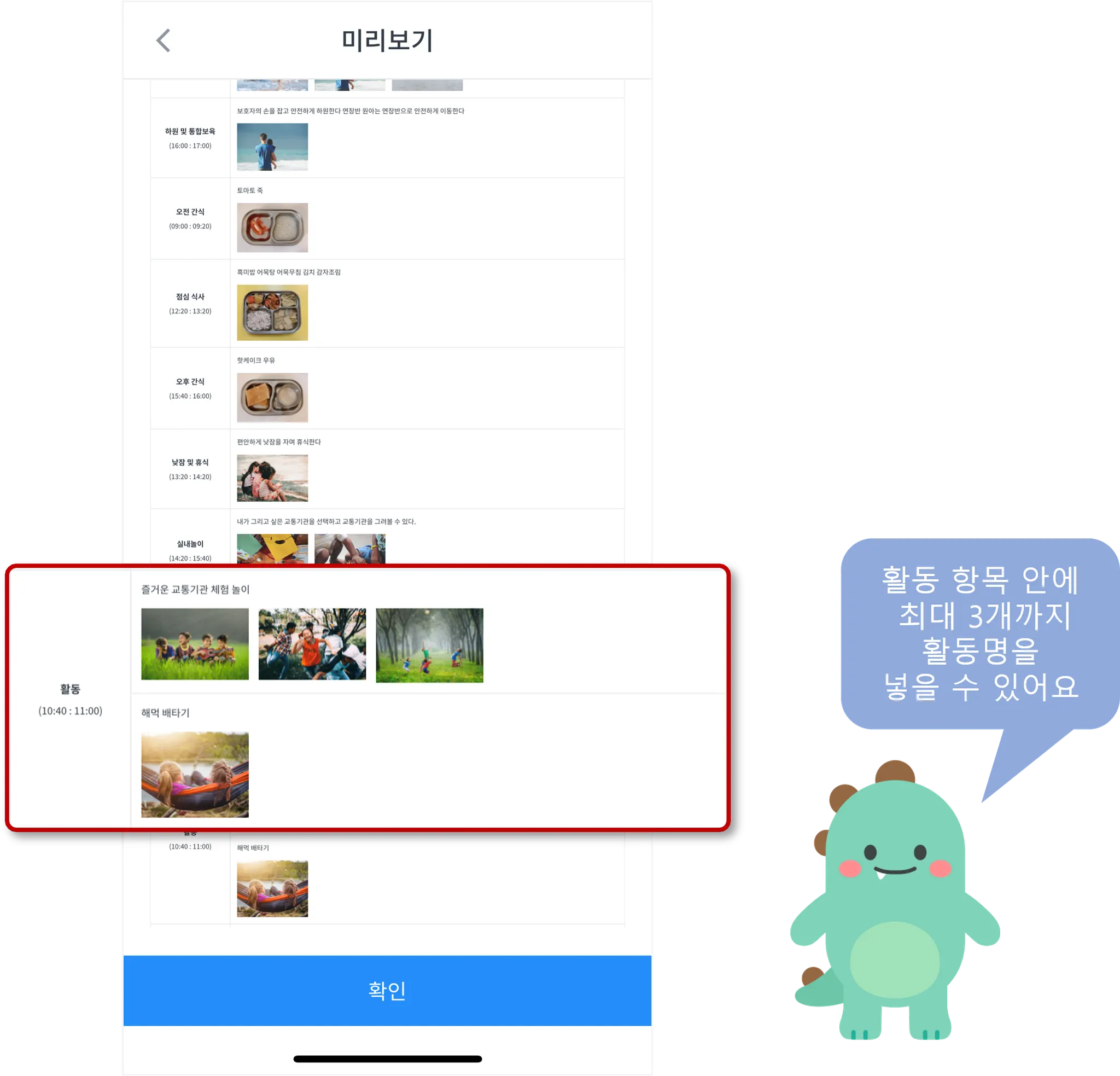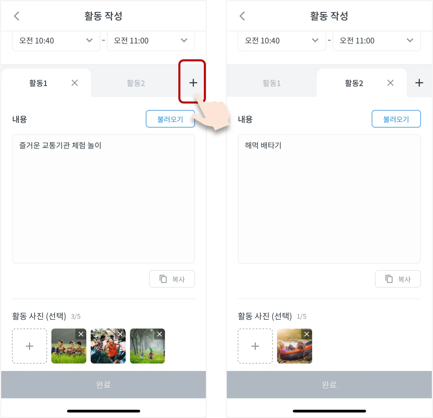 - 활동 시간 내 여러가지 활동을 진행하는 경우, + 아이콘을 눌러 활동을 추가해주세요. 미리보기 화면에 활동한 내용이 나뉘어 보여집니다.