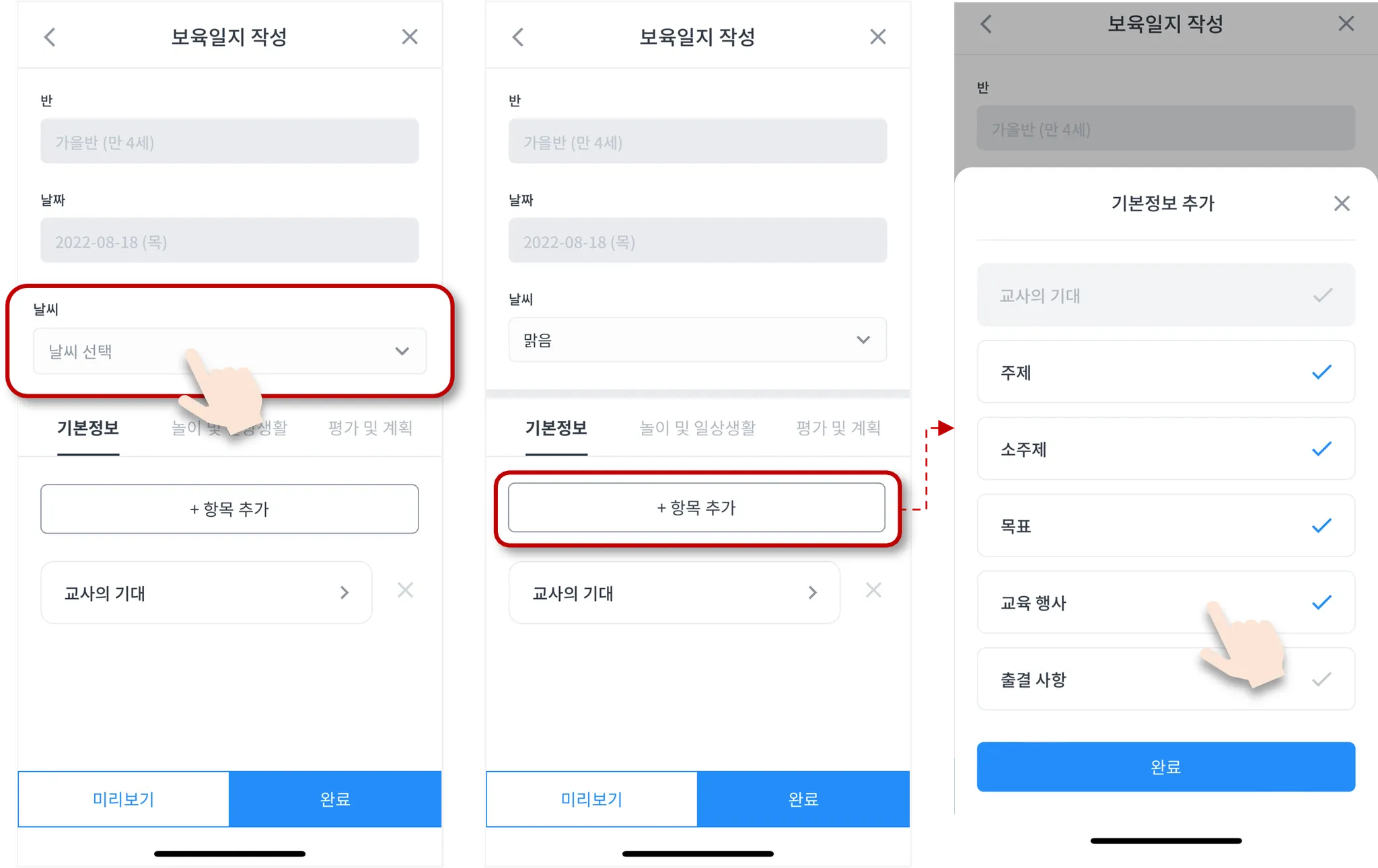 날씨를 선택하고 보육일지에 들어갈 항목을 추가해주세요.