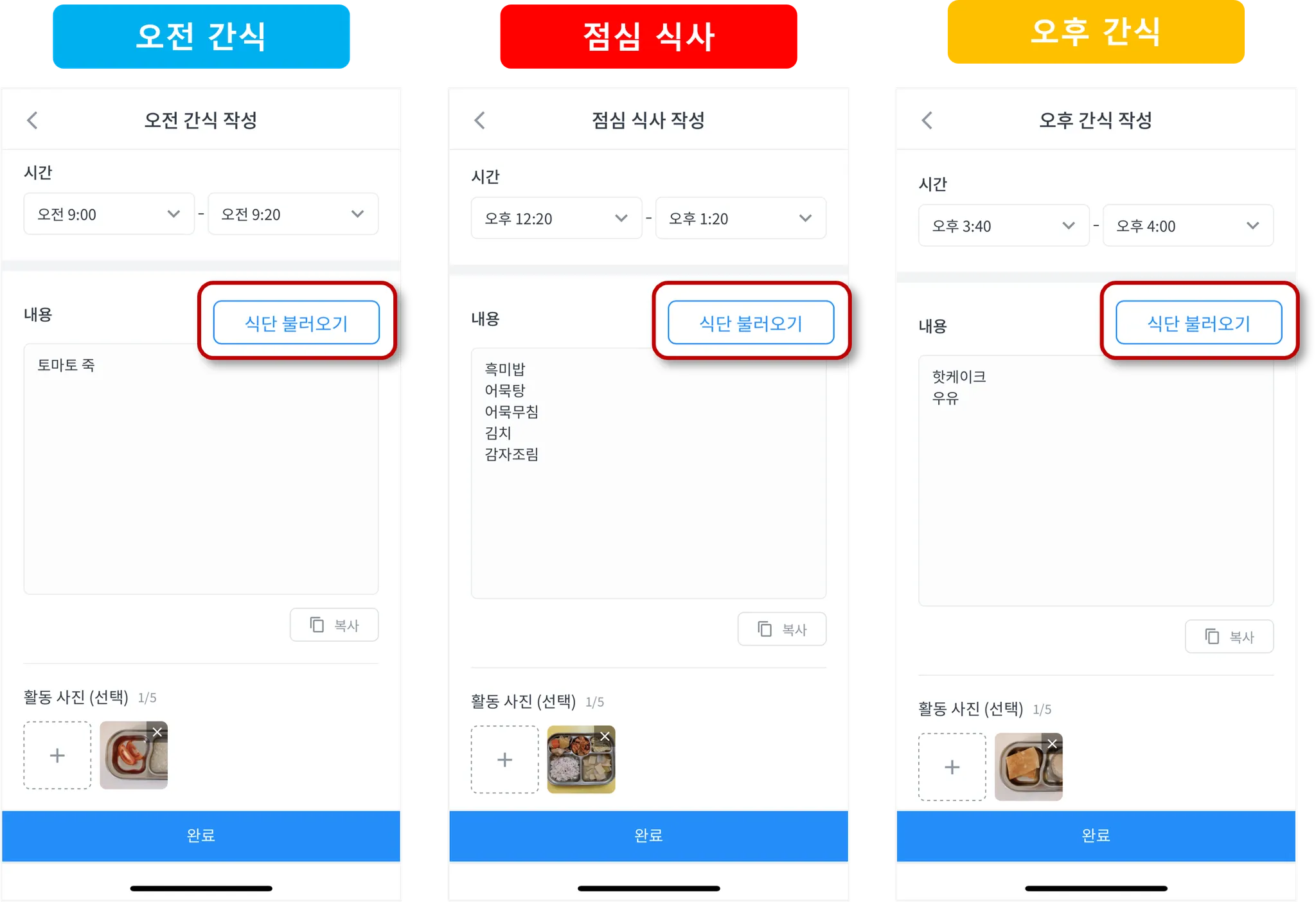 키즈노트 식단표 메뉴를 사용하신다면 오전 간식, 점심, 오후 간식을 식단 불러오기로 편리하게 작성할 수 있습니다.