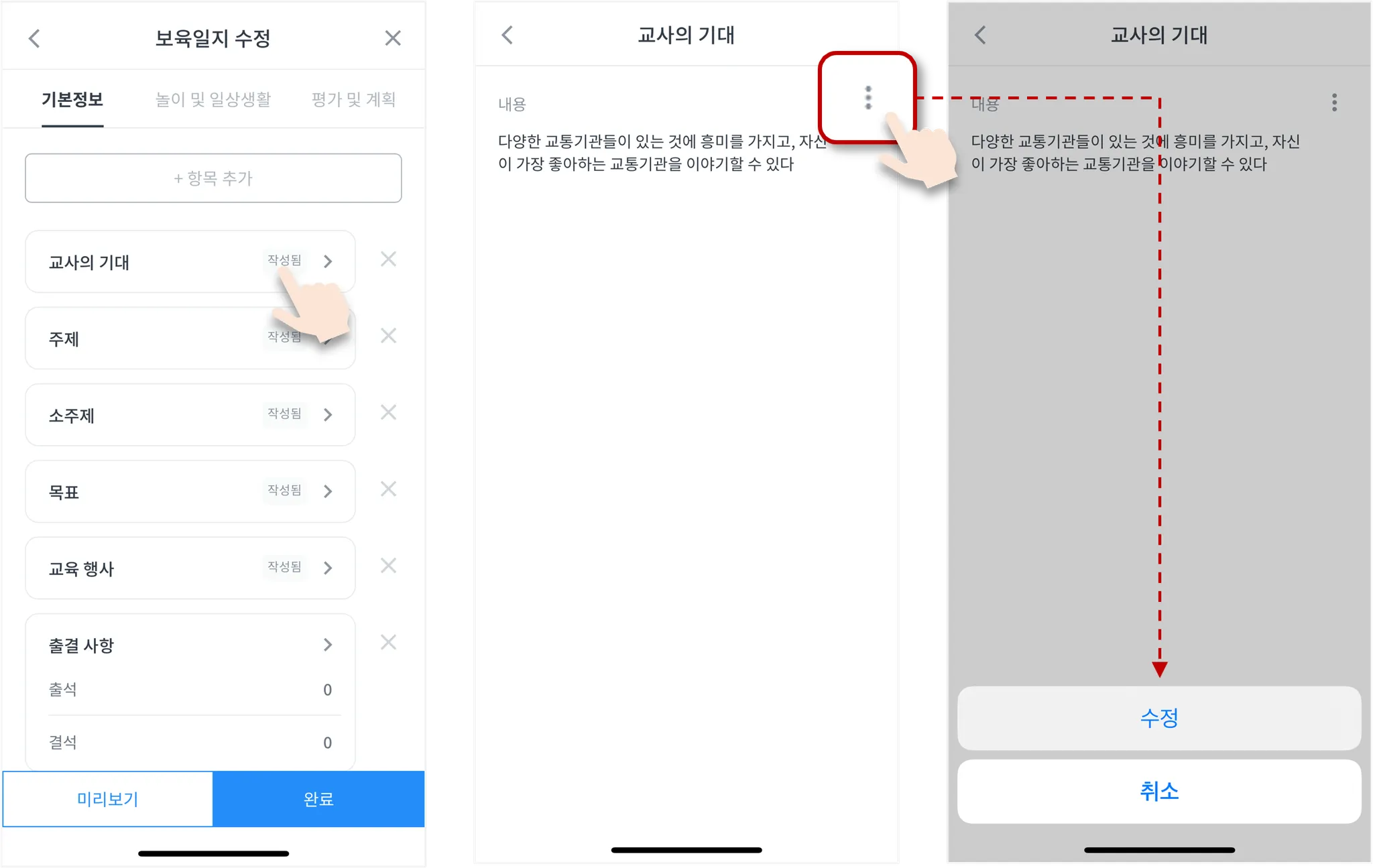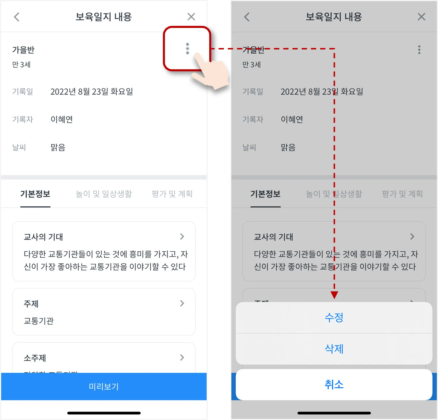보육일지 작성을 완료한 상태에서 우측 상단 더보기 버튼을 선택하면 해당 보육일지를 수정하거나 삭제할 수 있습니다.