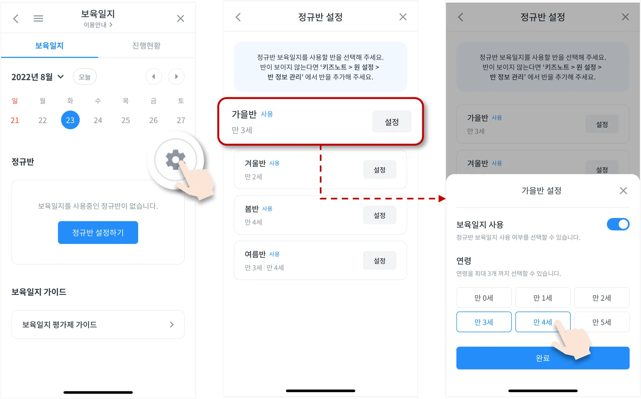 보육일지를 작성할 반 목록을 수정하려면 반 목록 우측 설정