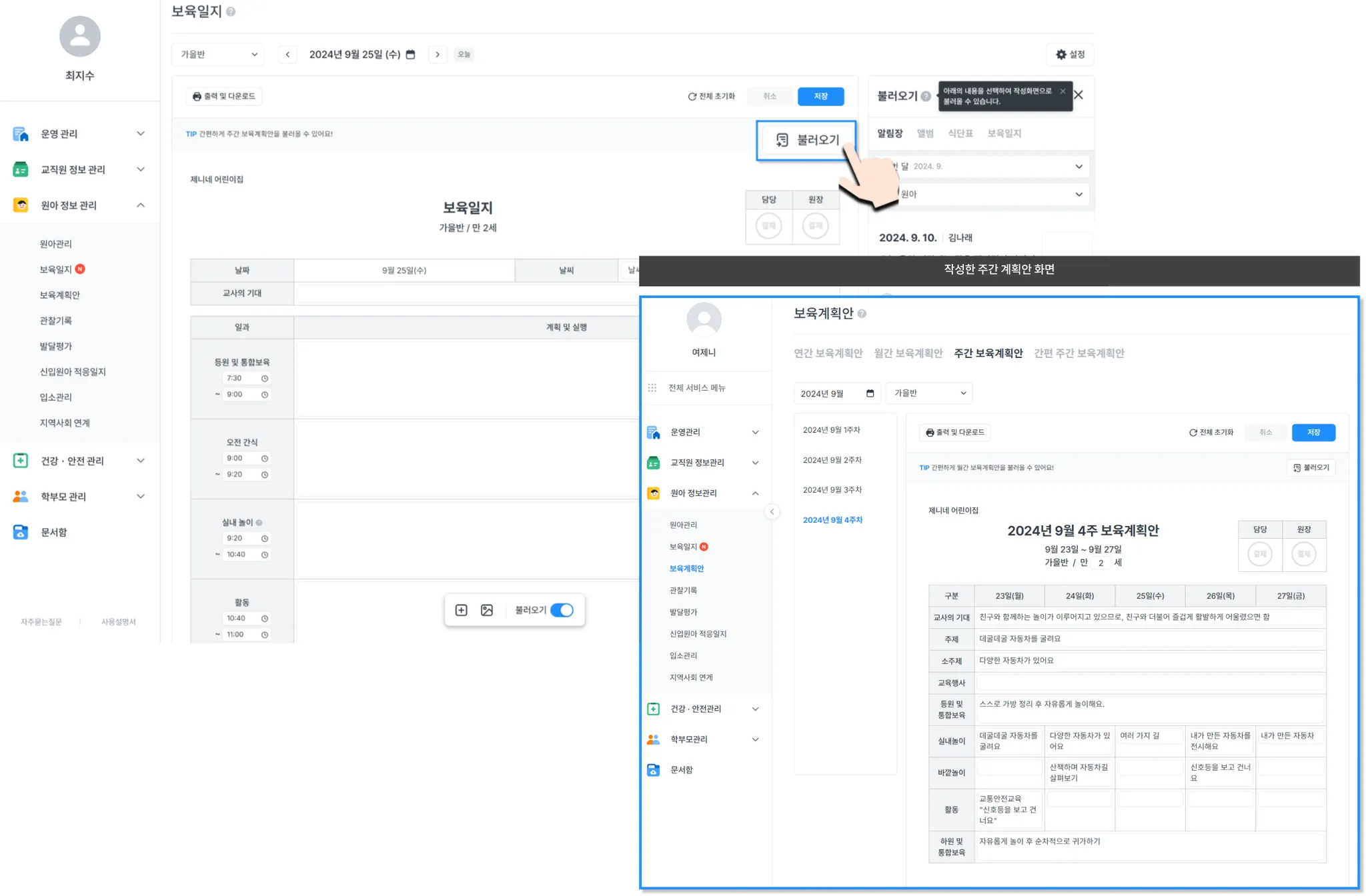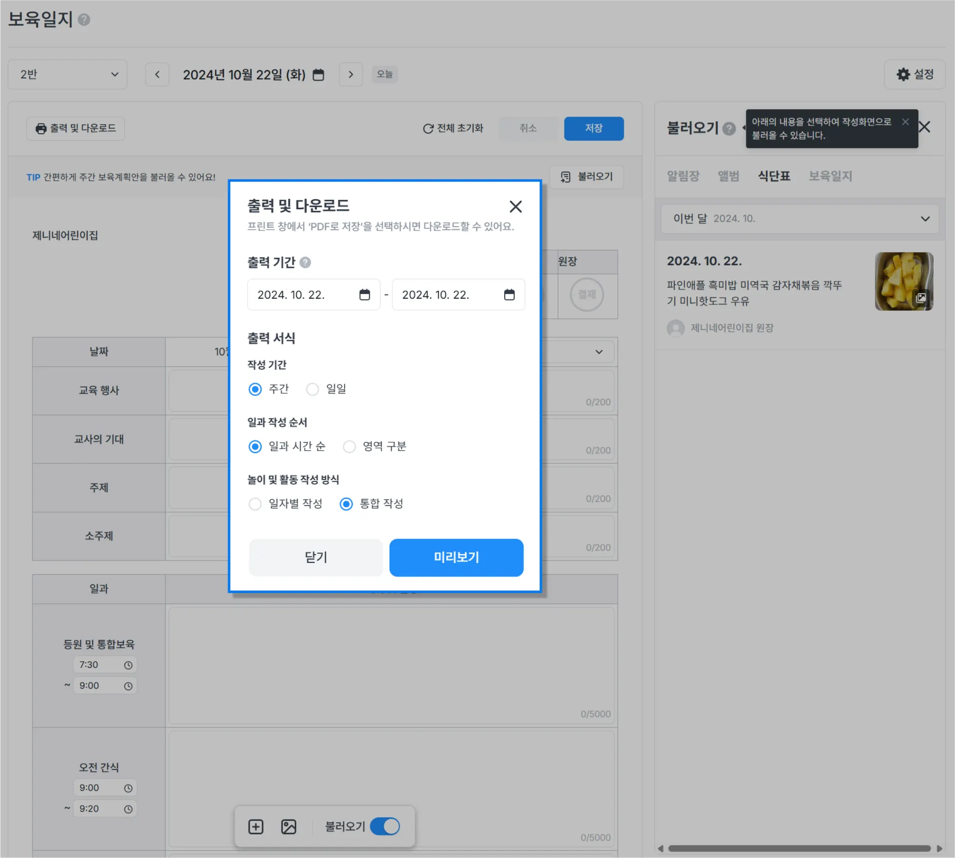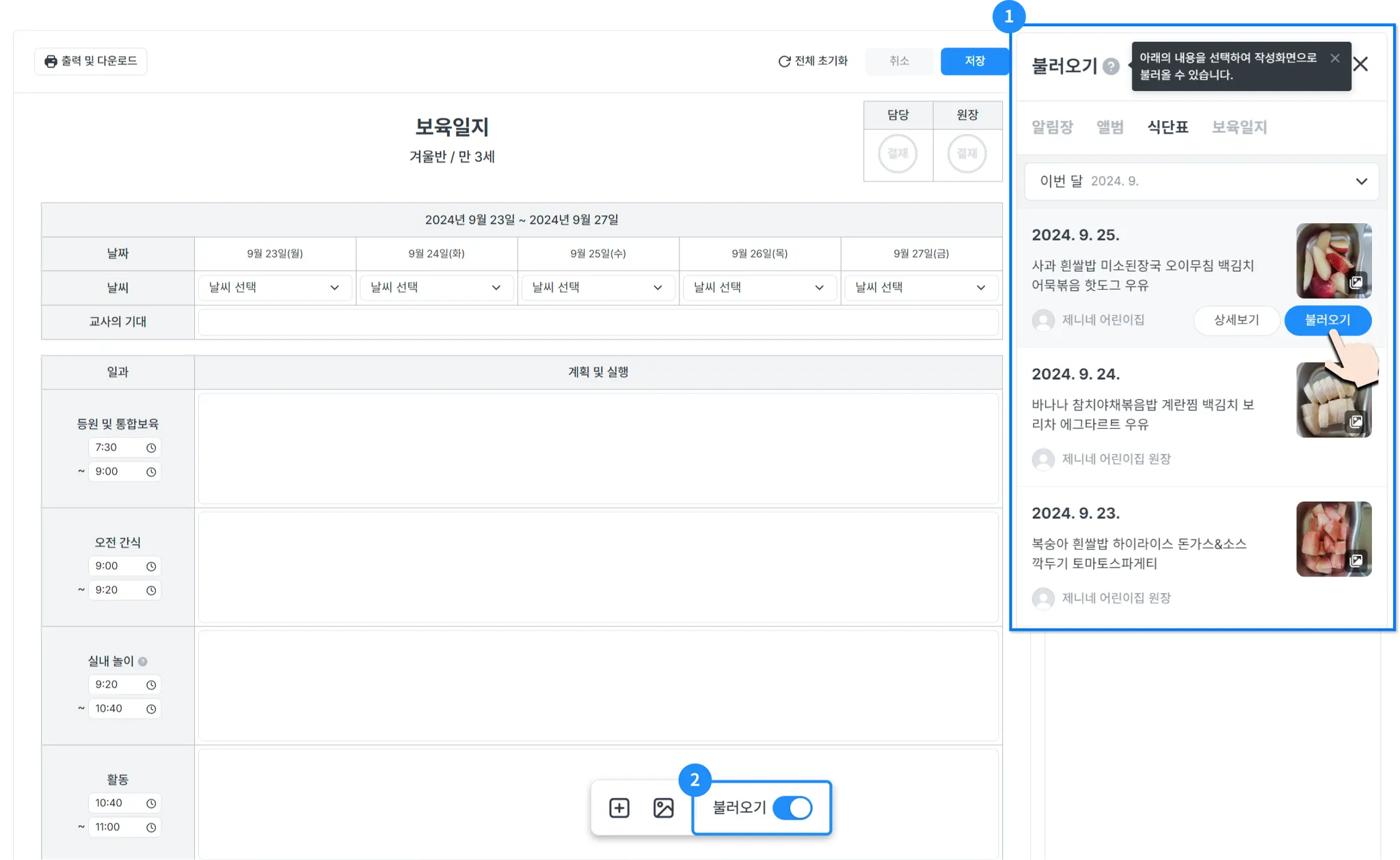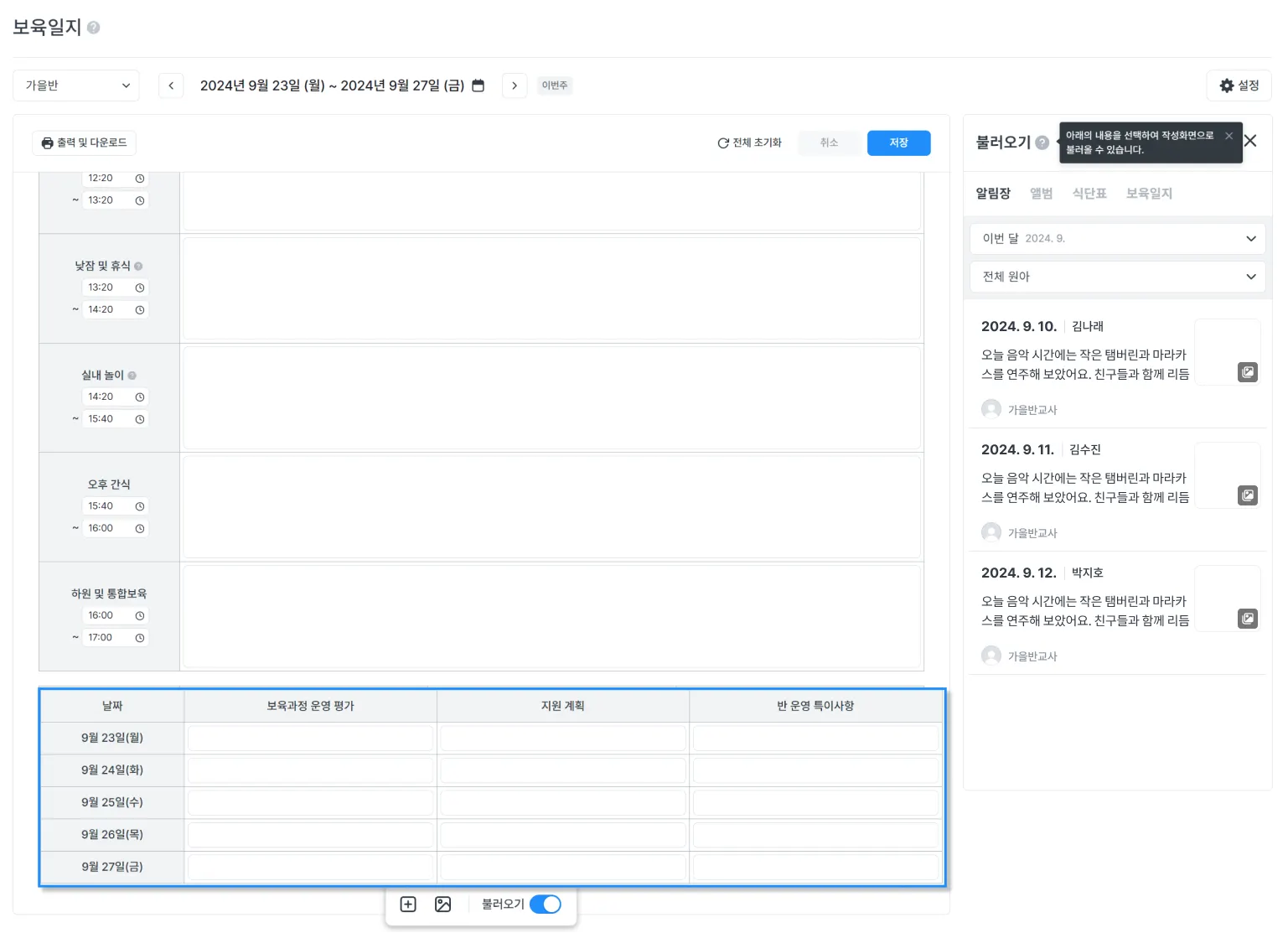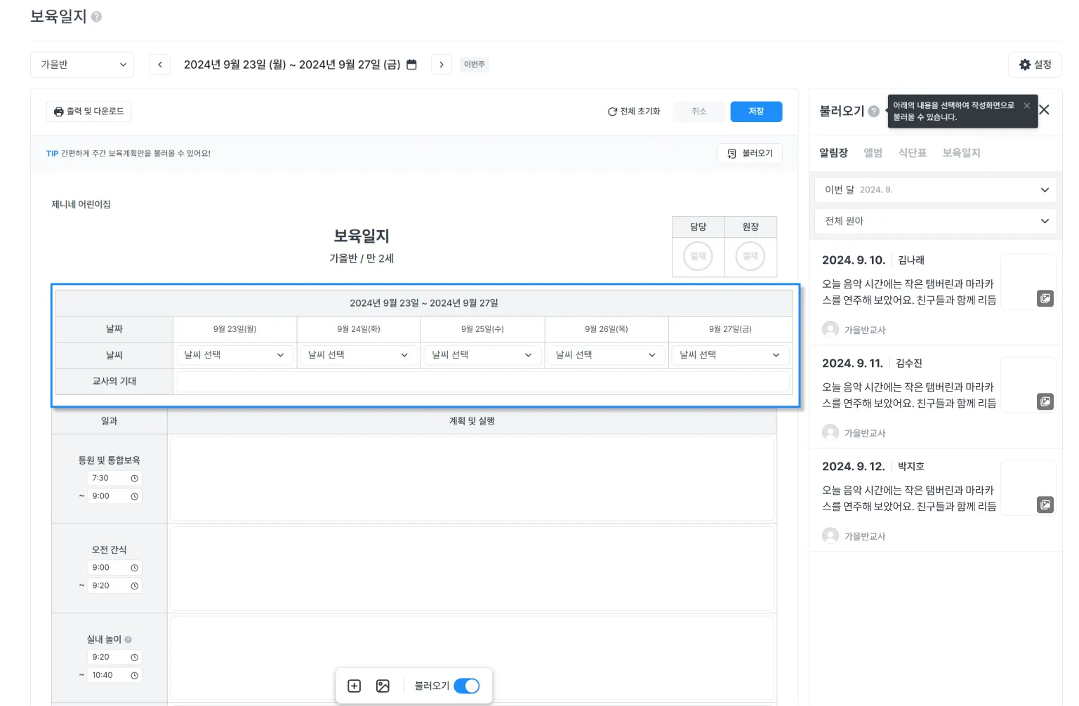 키즈노트에 작성한 알림장/앨범/식단표/보육일지/주간 계획안을 불러와 편리하게 작성할 수 있어요!