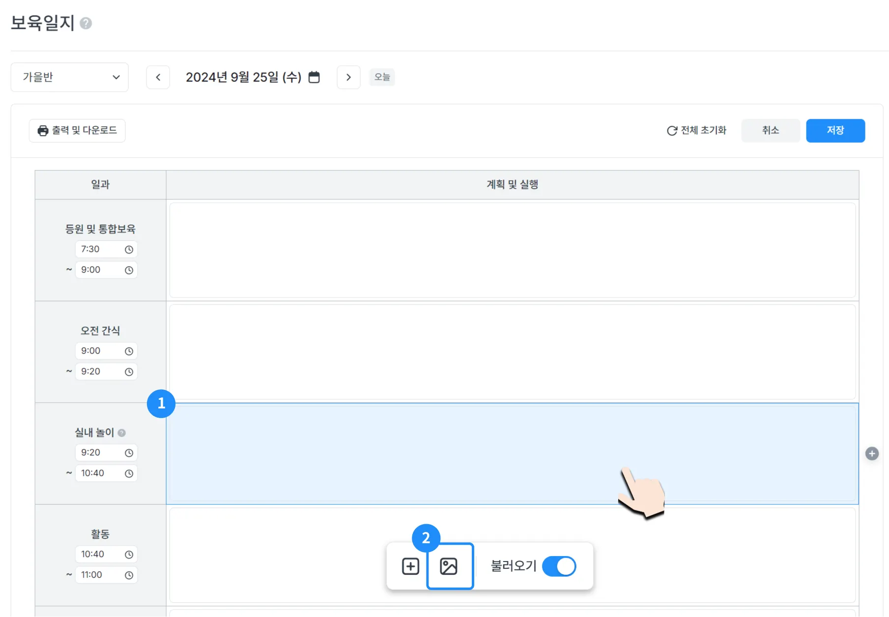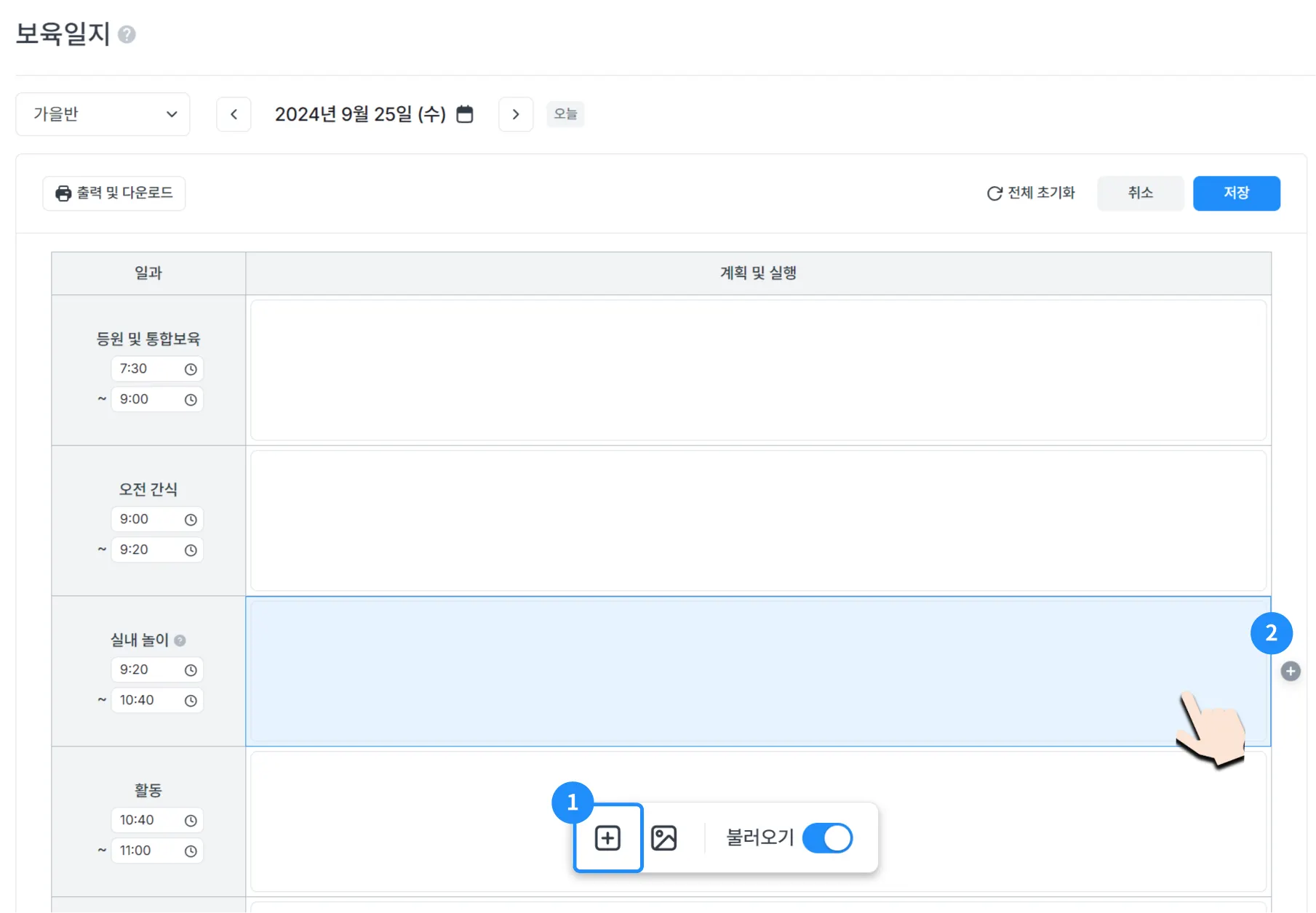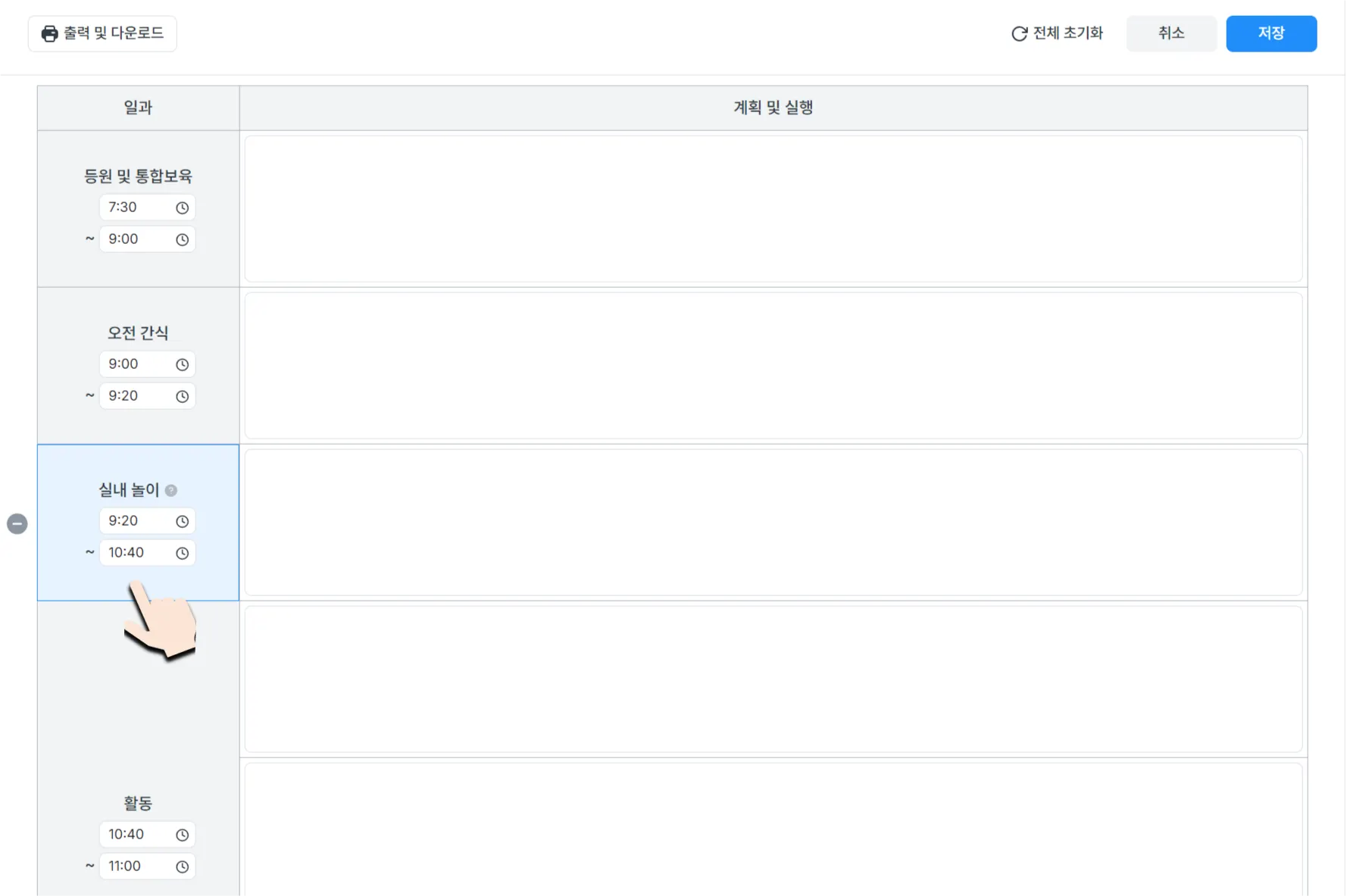 - 행 추가 가능 일과 : 실내놀이, 활동, 바깥놀이, 특별활동, 특성화프로그램