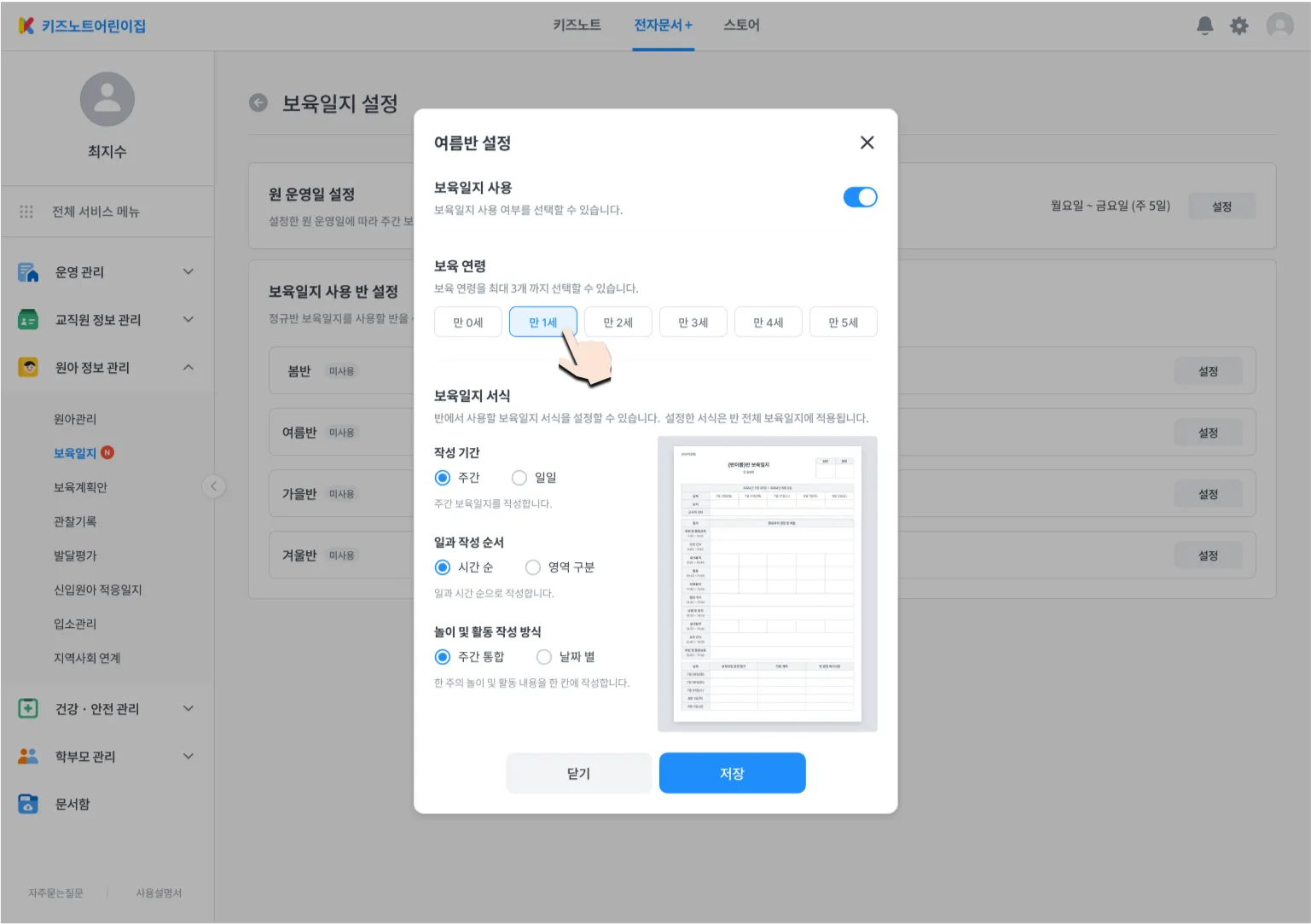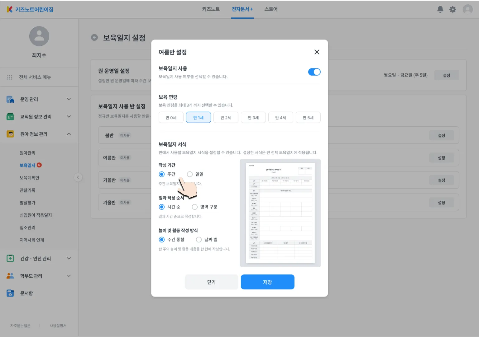 반에서 사용할 보육일지에 따라 주간/일일 항목, 일과 작성 순서, 놀이 및 활동 작성 방식을 선택해 주세요.
