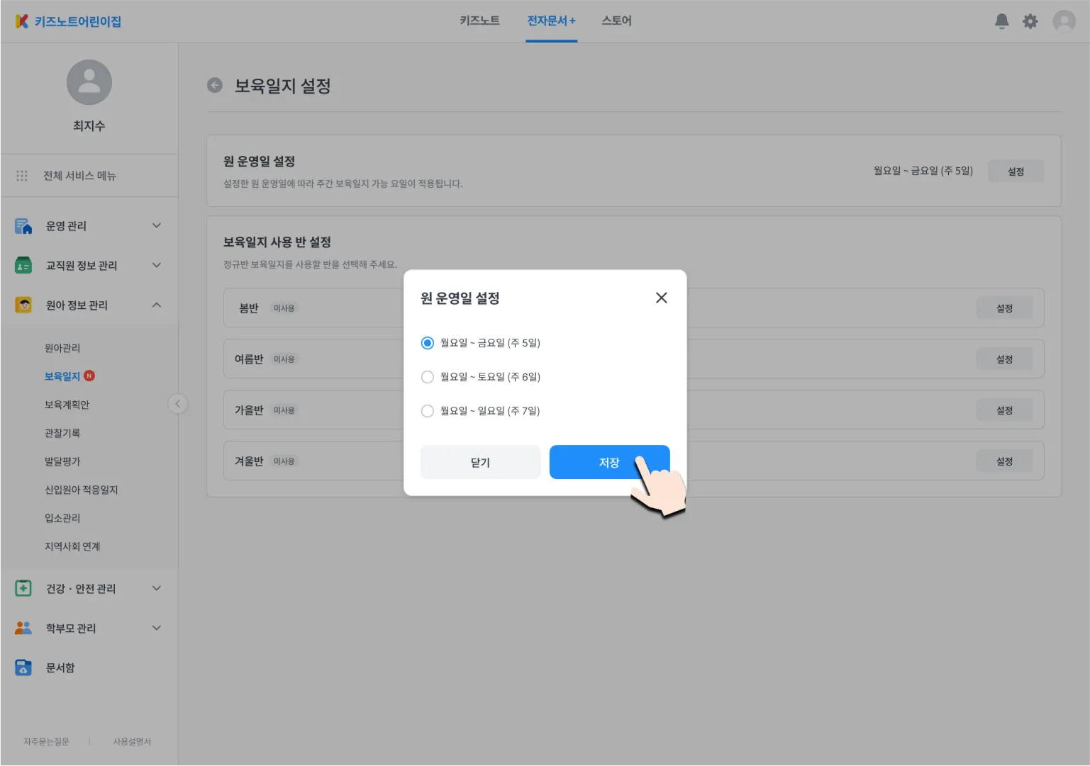 원 운영일을 설정해 주세요. 설정한 원 운영일에 따라 주간 보육일지 요일이 적용됩니다.