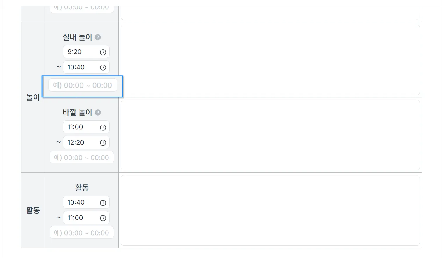 보육일지 서식 설정을 영역 구분으로 선택한 경우, 해당 놀이 시간을 추가 입력할 수 있어요.
