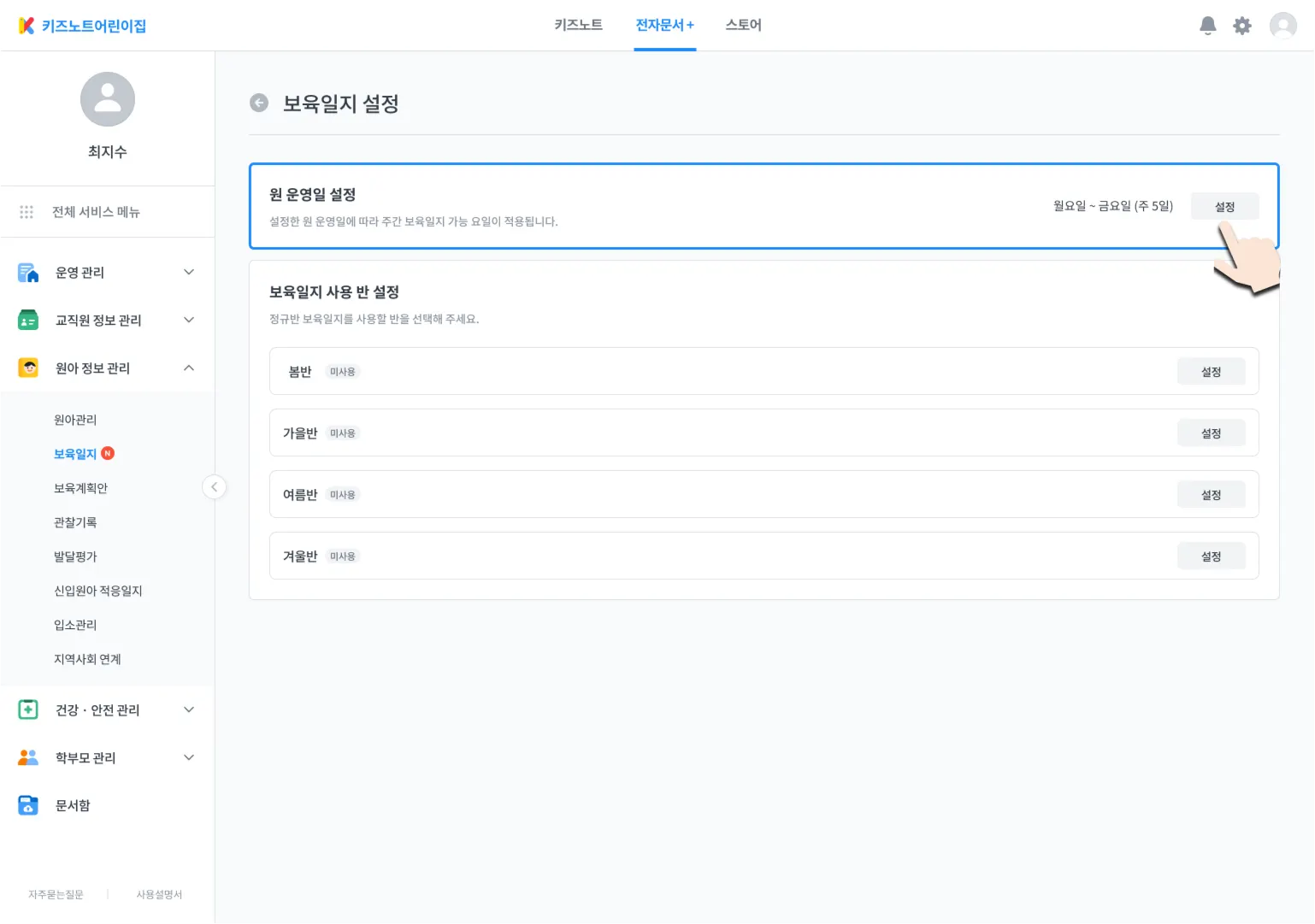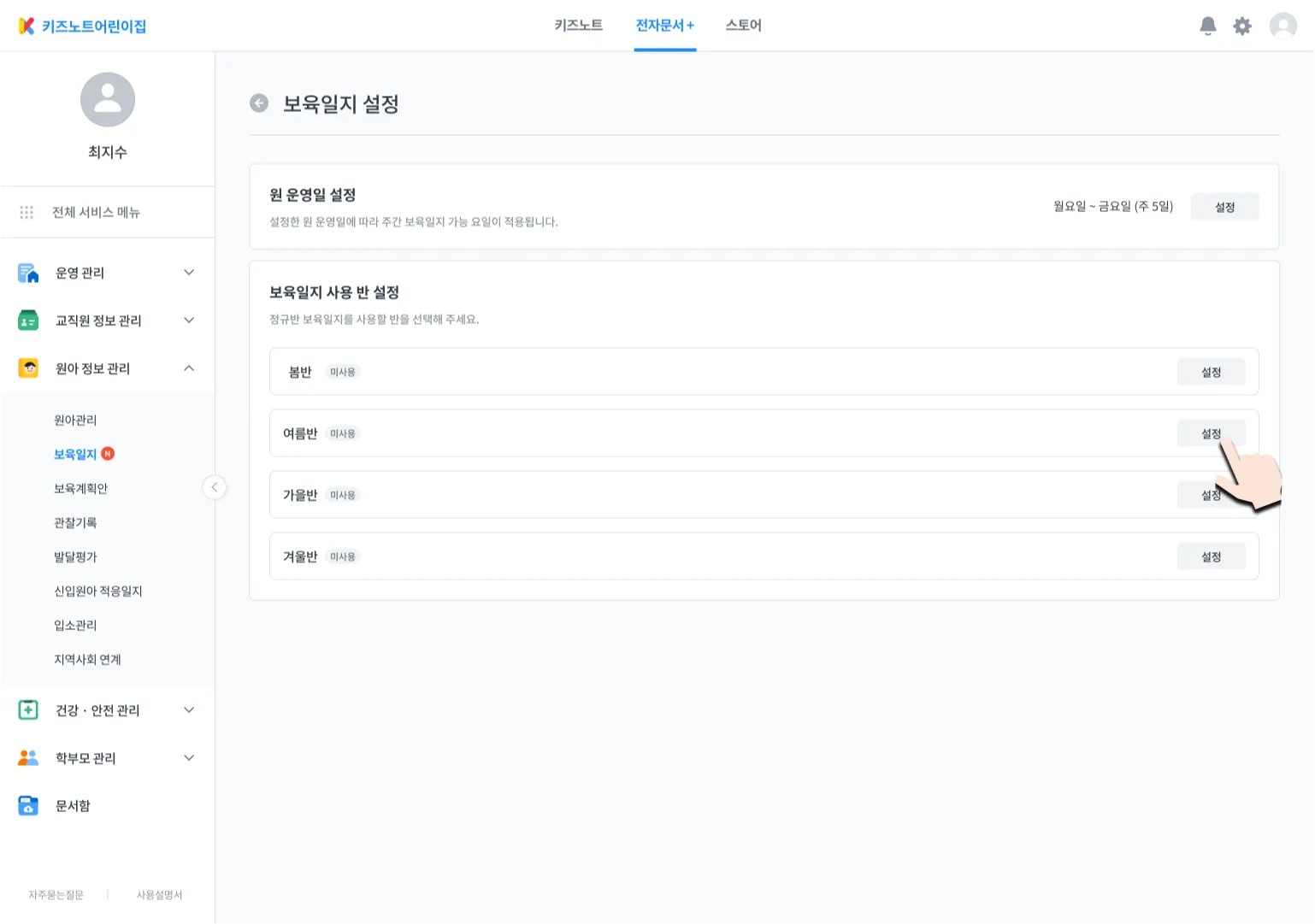 보육일지를 사용할 반의 설정 메뉴를 클릭해 주세요.