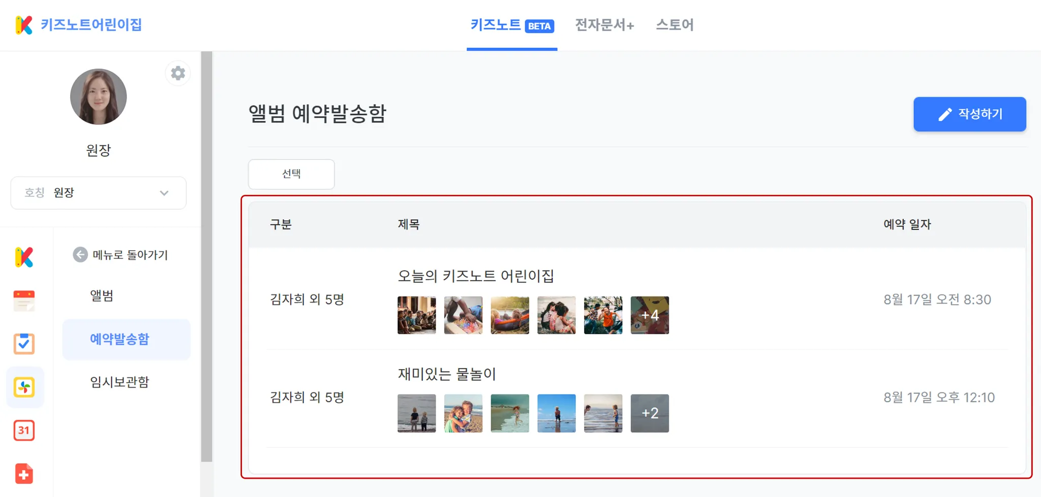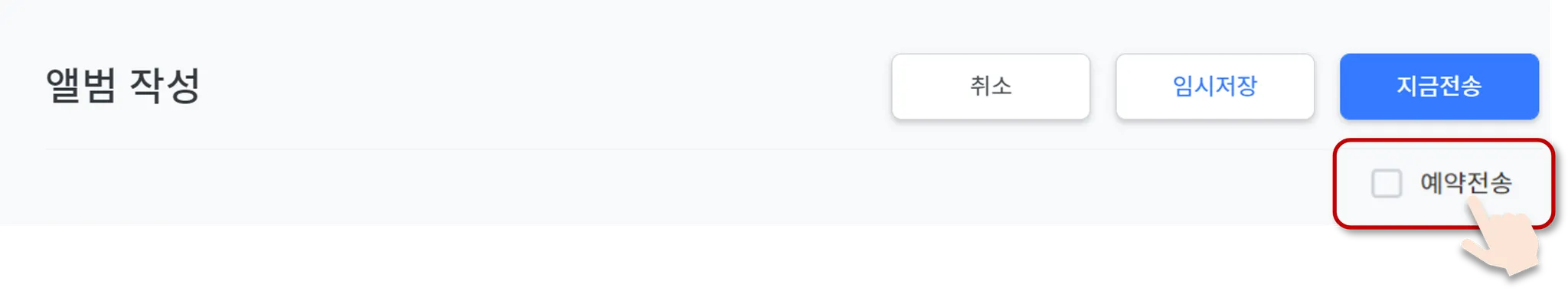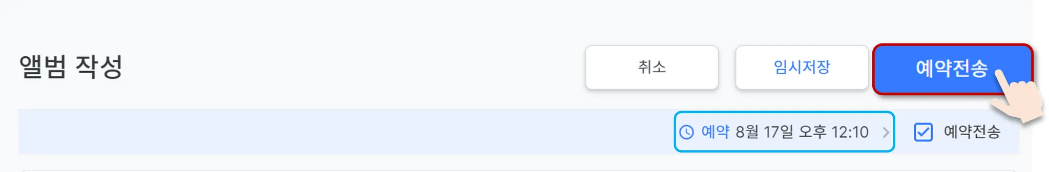 작성한 앨범을 예약발송 하려면, 우측 상단의 예약전송 버튼을 눌러주세요.
