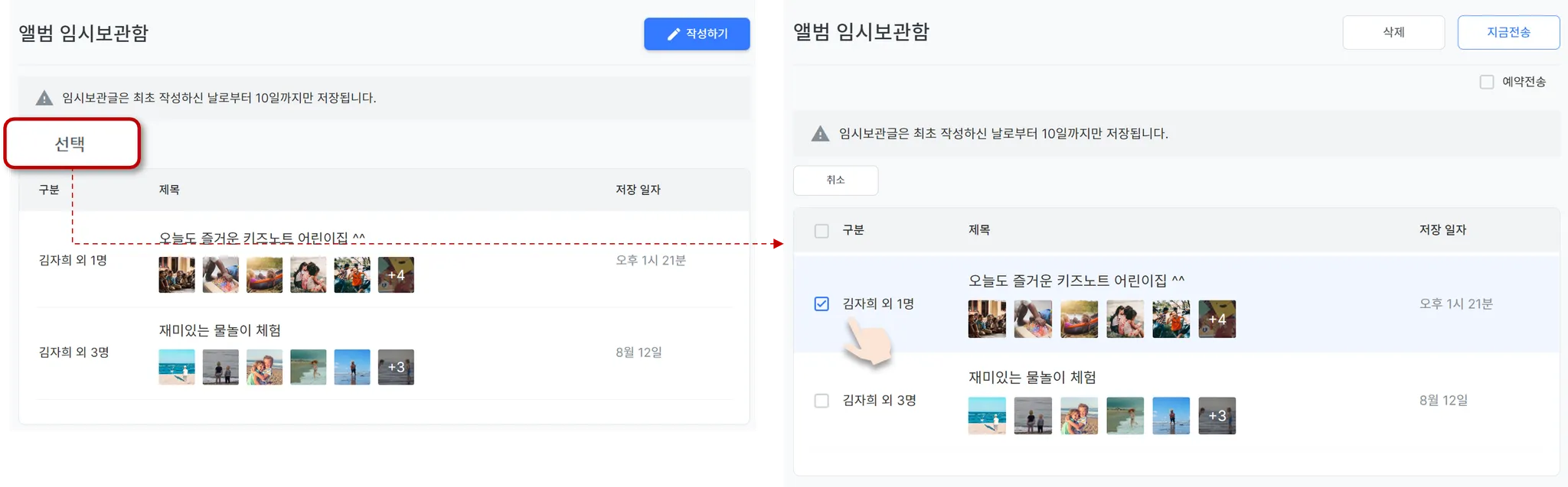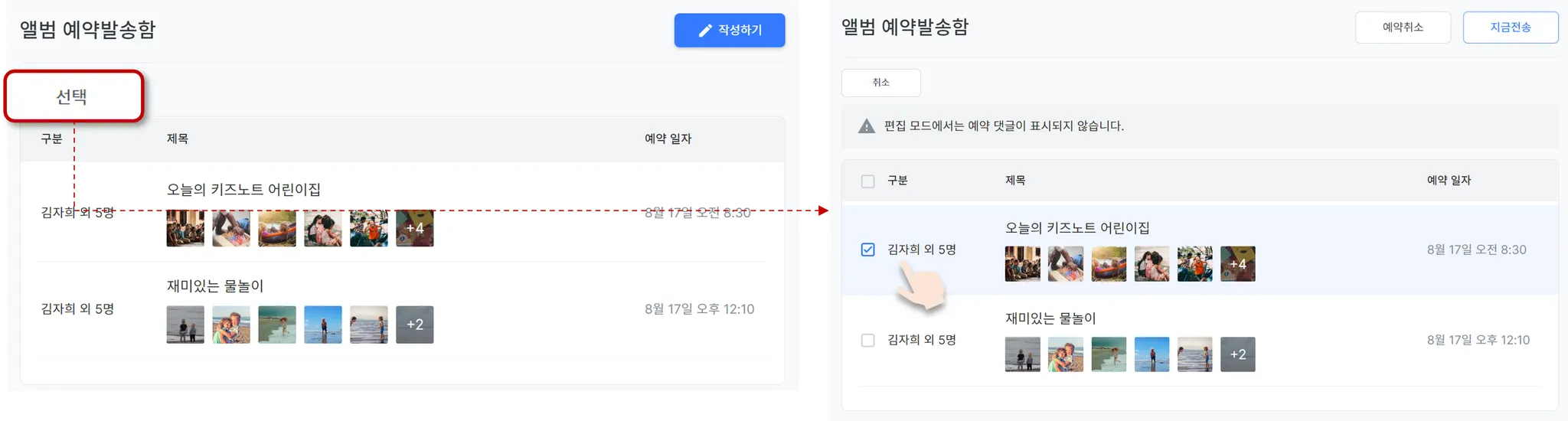 좌측의 선택 버튼을 클릭하면 앨범을 선택하고 전송, 삭제, 예약 전송 할 수 있어요.