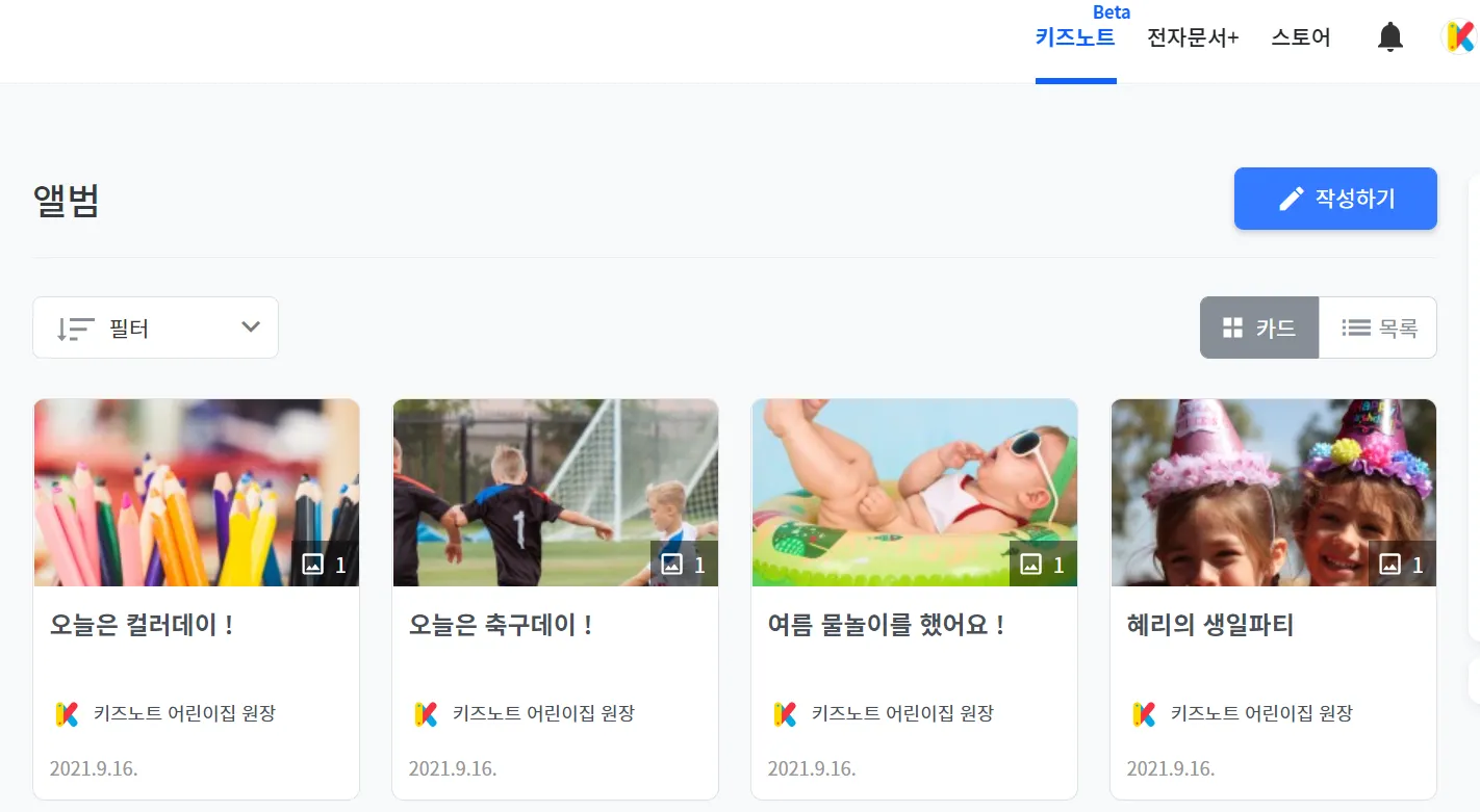 필터를 이용하면 원하는 날짜, 원아 등을 선택하여 앨범을 확인할 수 있습니다.