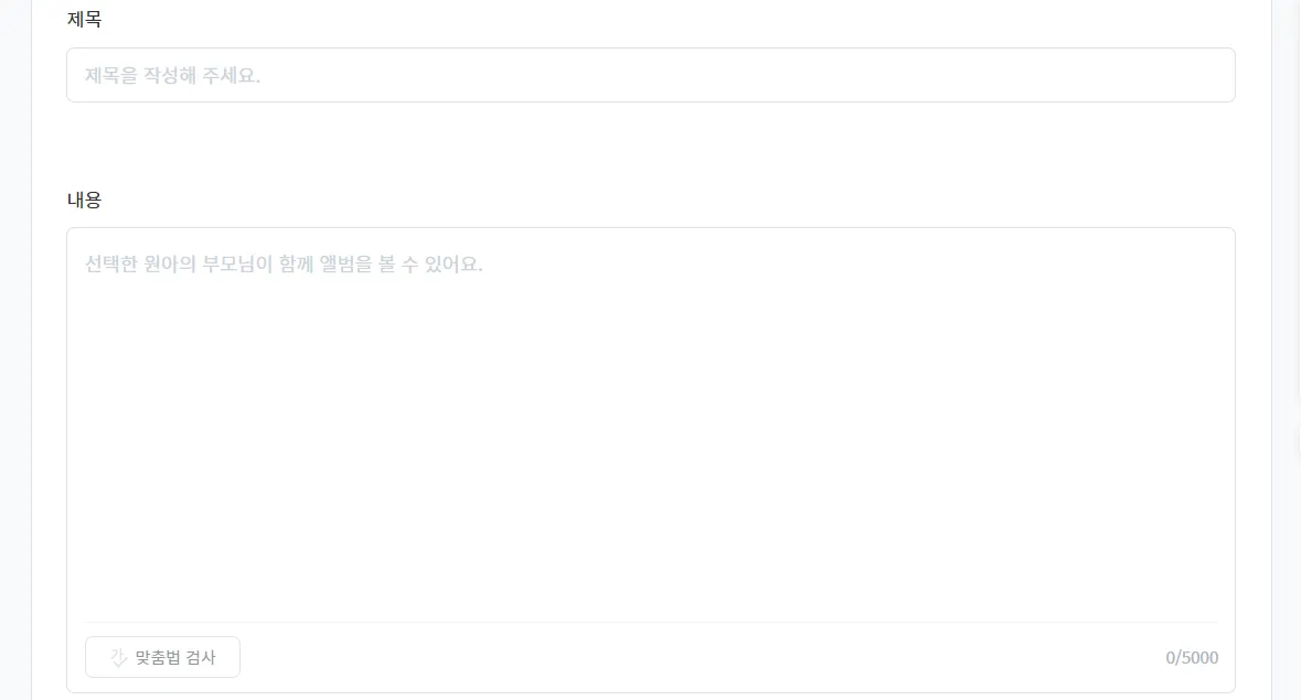 앨범의 제목 내용(최대 5000자)를 작성해주세요. 앨범의 제목을 작성하지 않으면 무제로 기록되고, 내용은 선택항목이니 꼭 작성하지 않으셔도 됩니다. 앨범 작성 시 맞춤법 검사 기능을 활용하면 맞춤법과 띄어쓰기 오류 등을 확인하고, 내용을 바로 교정할 수 있습니다.