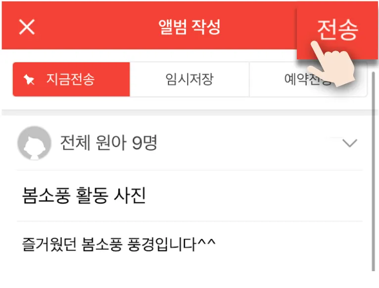 - 지금전송 : 전송을 누르는 즉시 부모님께 알림장이 발송됩니다.