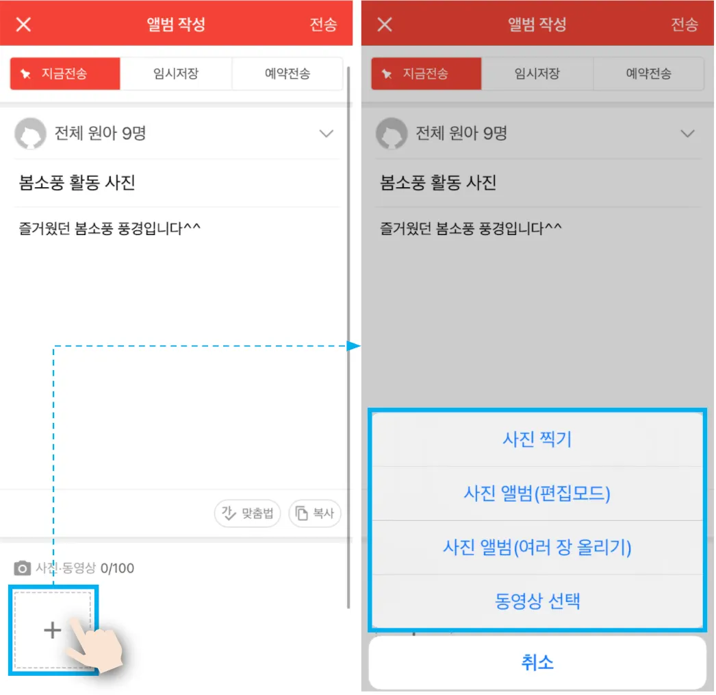 앨범에서 사진 혹은 동영상 업로드는 필수 항목으로, 반드시 파일 첨부가 되어야합니다.
