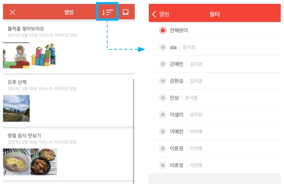 앨범 목록에서 필터 를 이용하여 원아별로 게시글을 확인할 수 있습니다.