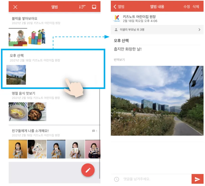 - 앨범 댓글은 원장님을 포함하여, 해당 앨범 글을 볼 수 있도록 선택된 원아의 학부모님과 담당 선생님들 간 소통이 가능합니다.