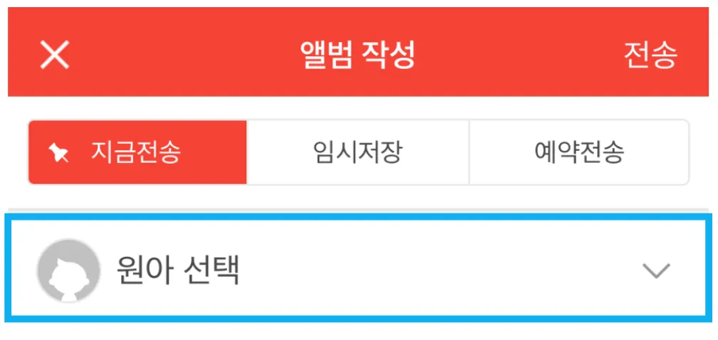 원아 선택을 클릭하여 앨범 게시글을 공유할 원아를 선택해주세요.