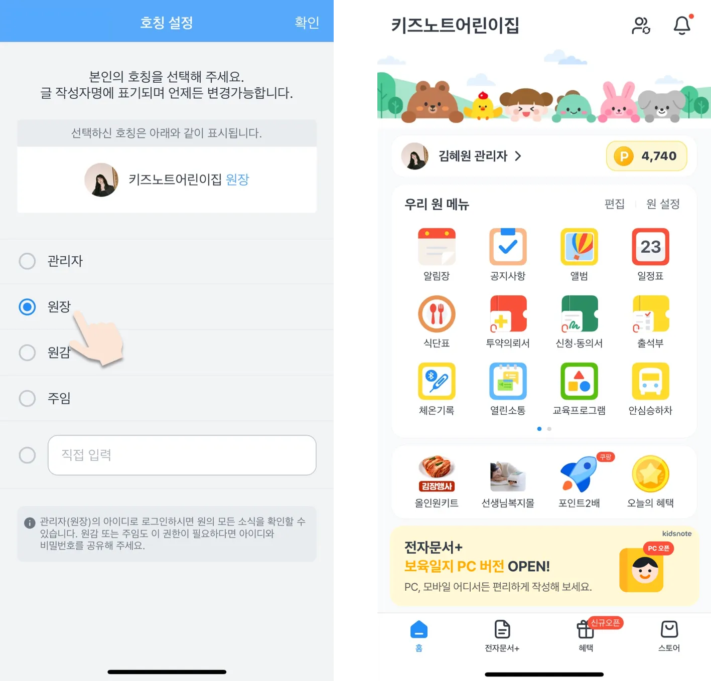 우리 원 공간이 개설되었습니다. 글을 작성할 때 표시될 호칭을 선택하면 키즈노트 홈 화면으로 이동합니다.