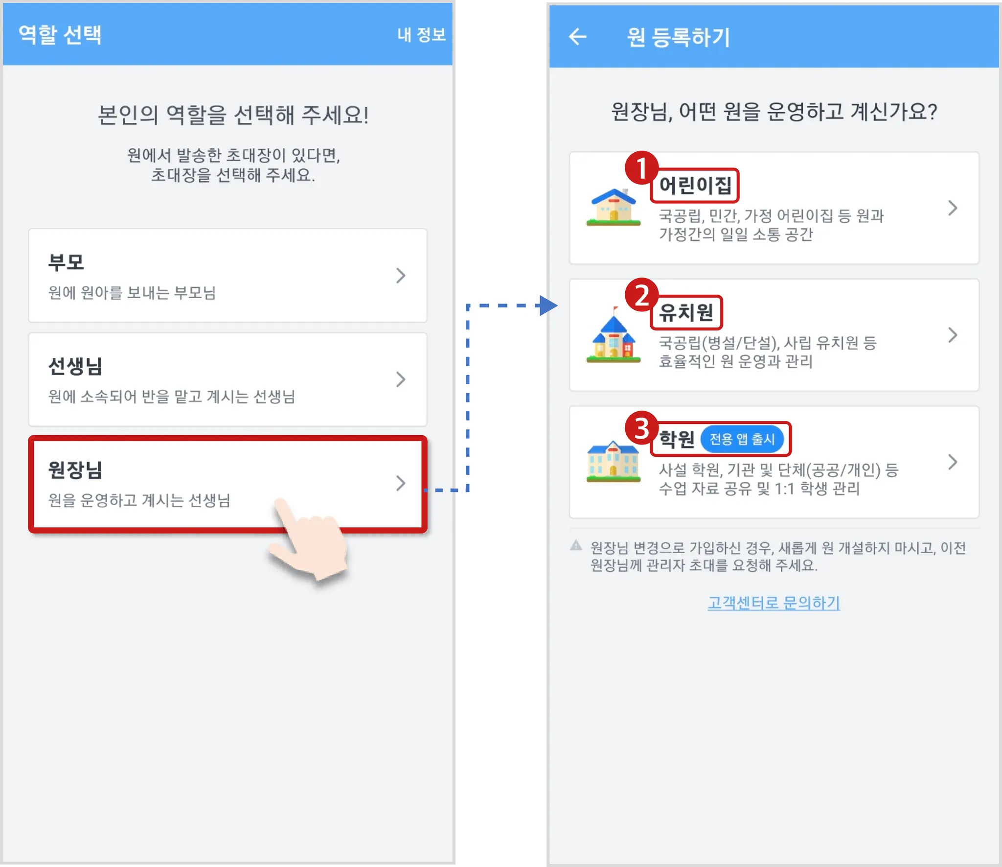 회원가입이 완료되었어요! 역할 선택 페이지에서 원장님을 누른 후, 원 등록하기 페이지에서 원장님이 운영하시는 시설의 종류를 선택합니다.