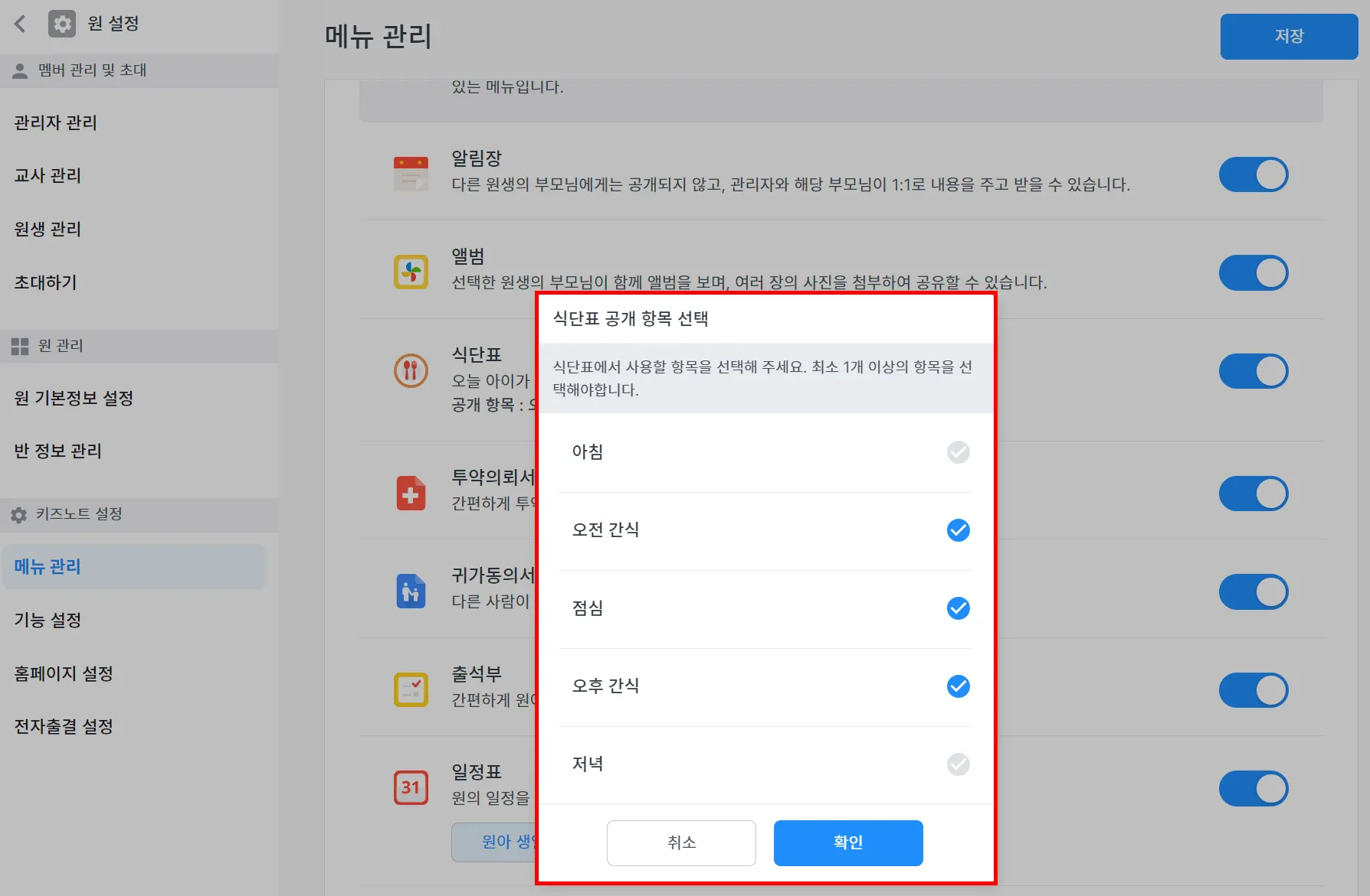 원에서 공개하고 싶은 식단 항목을 직접 선택할 수 있습니다. 원 설정 > 메뉴 관리에서 아침/오전 간식/점심/오후 간식/저녁 중 최소 1개 이상의 항목을 골라 식단표를 작성하세요.