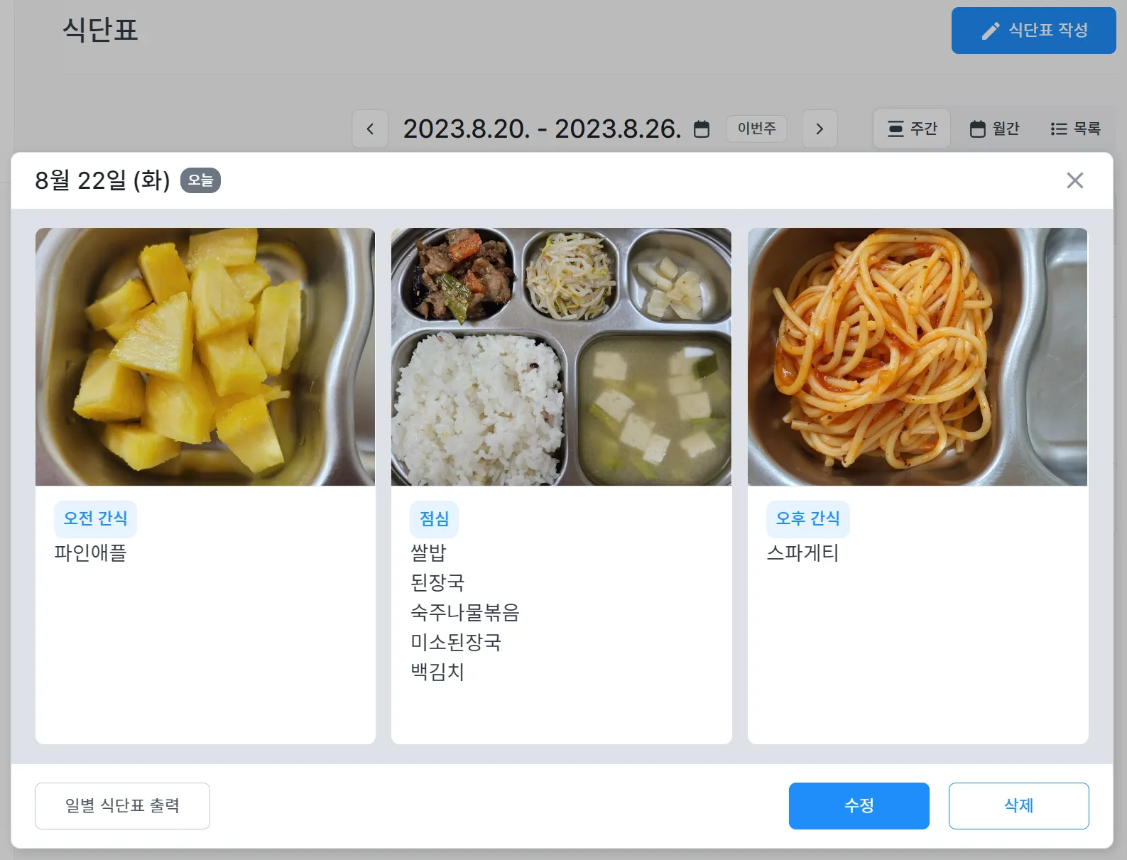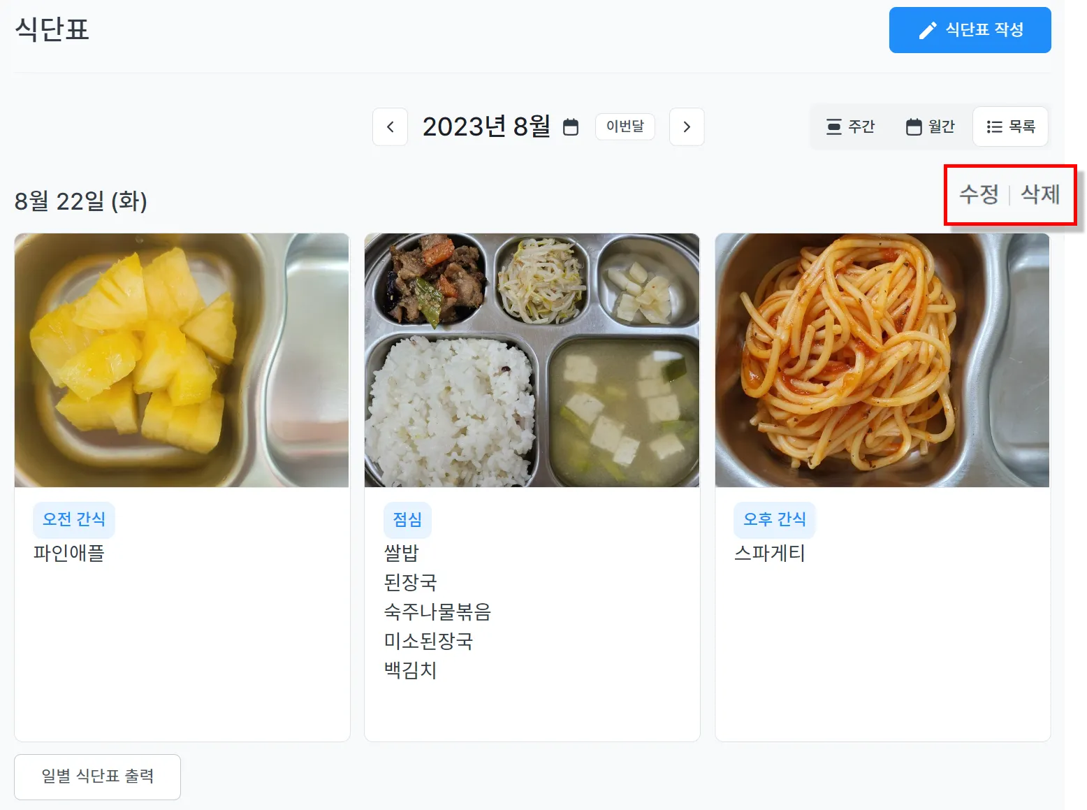 작성된 식단표를 목록에서 확인할 수 있으며, 수정/삭제가 가능합니다.