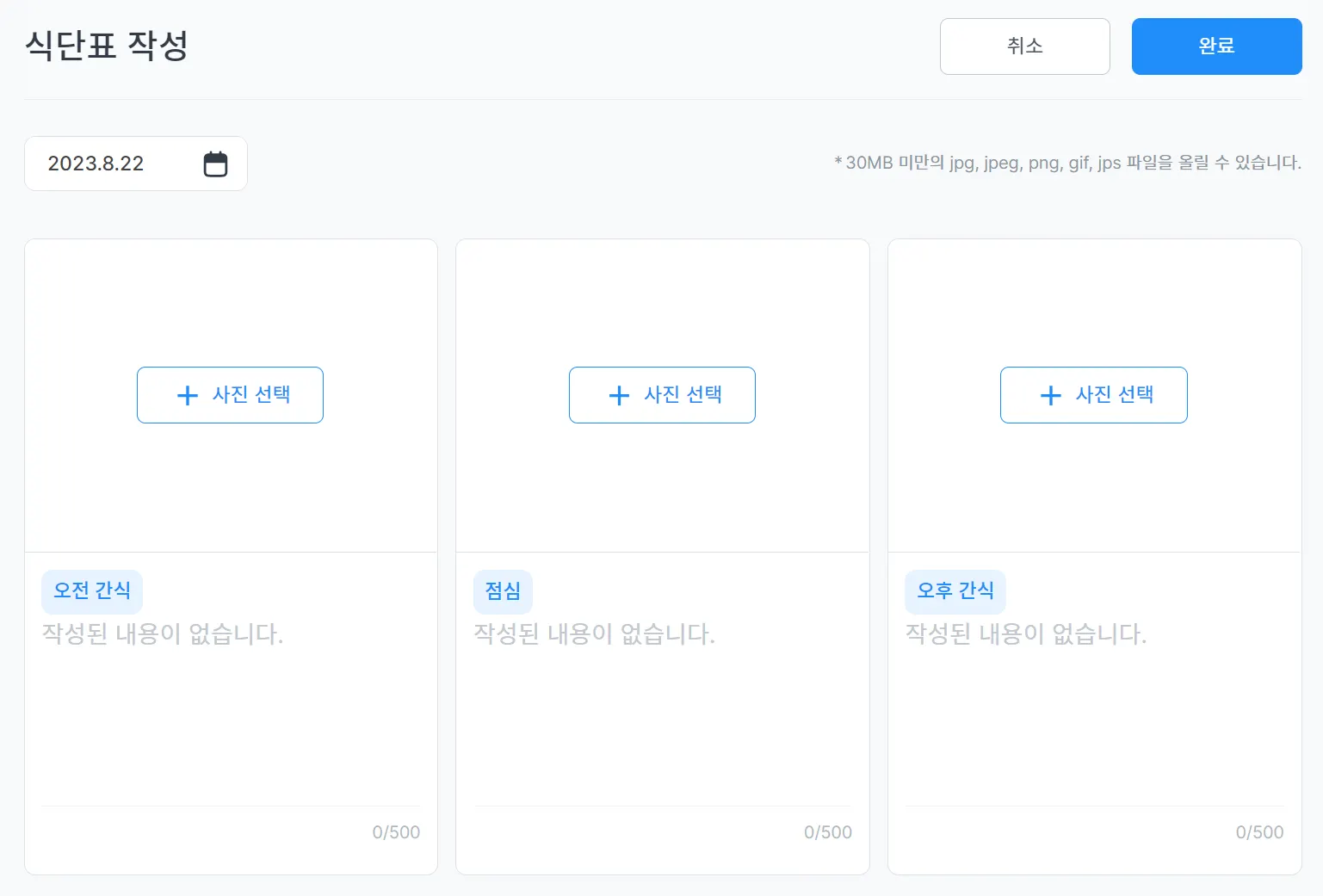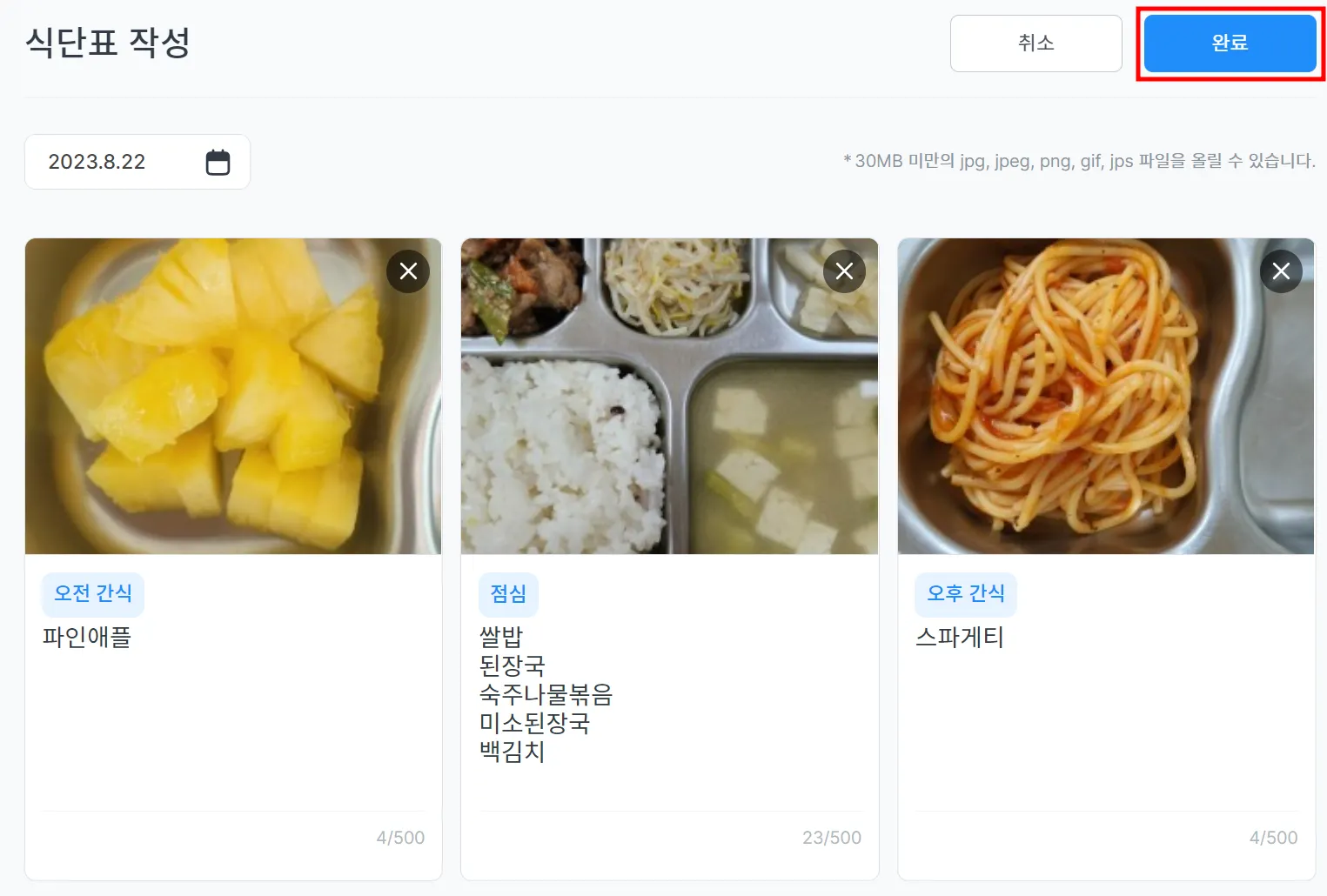 사진은 30MB미만의 jpg, png, gif, jps 파일을 올릴 수 있으며, 메뉴는 500자 이내로 작성합니다.