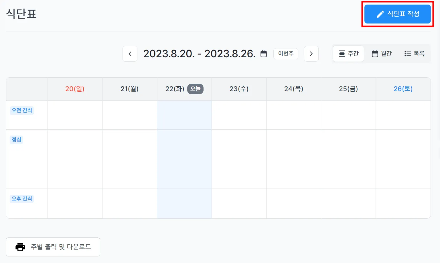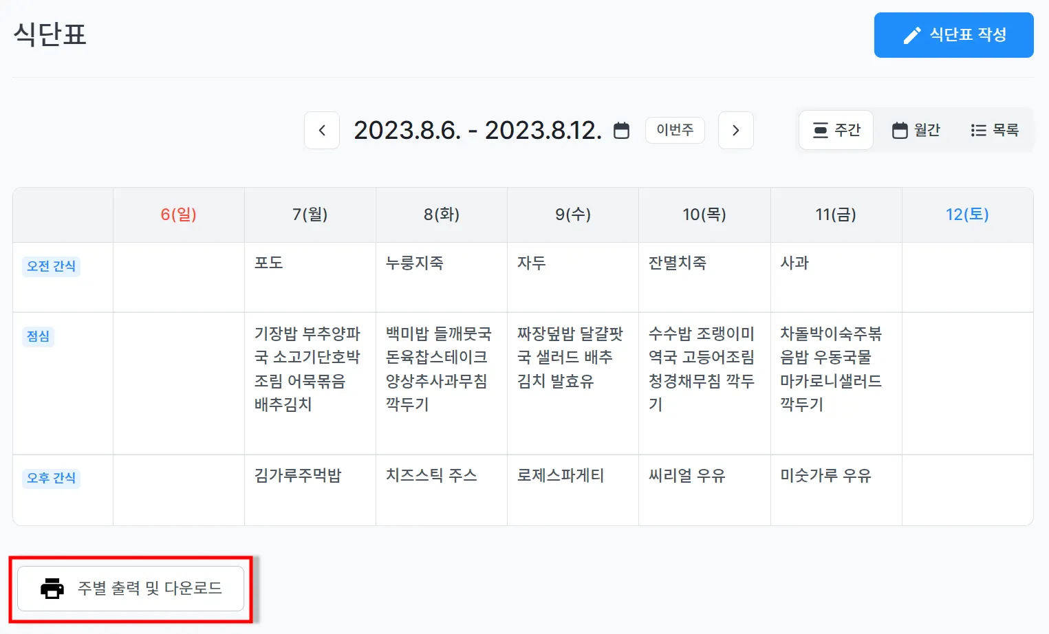 식단표 출력 및 다운로드