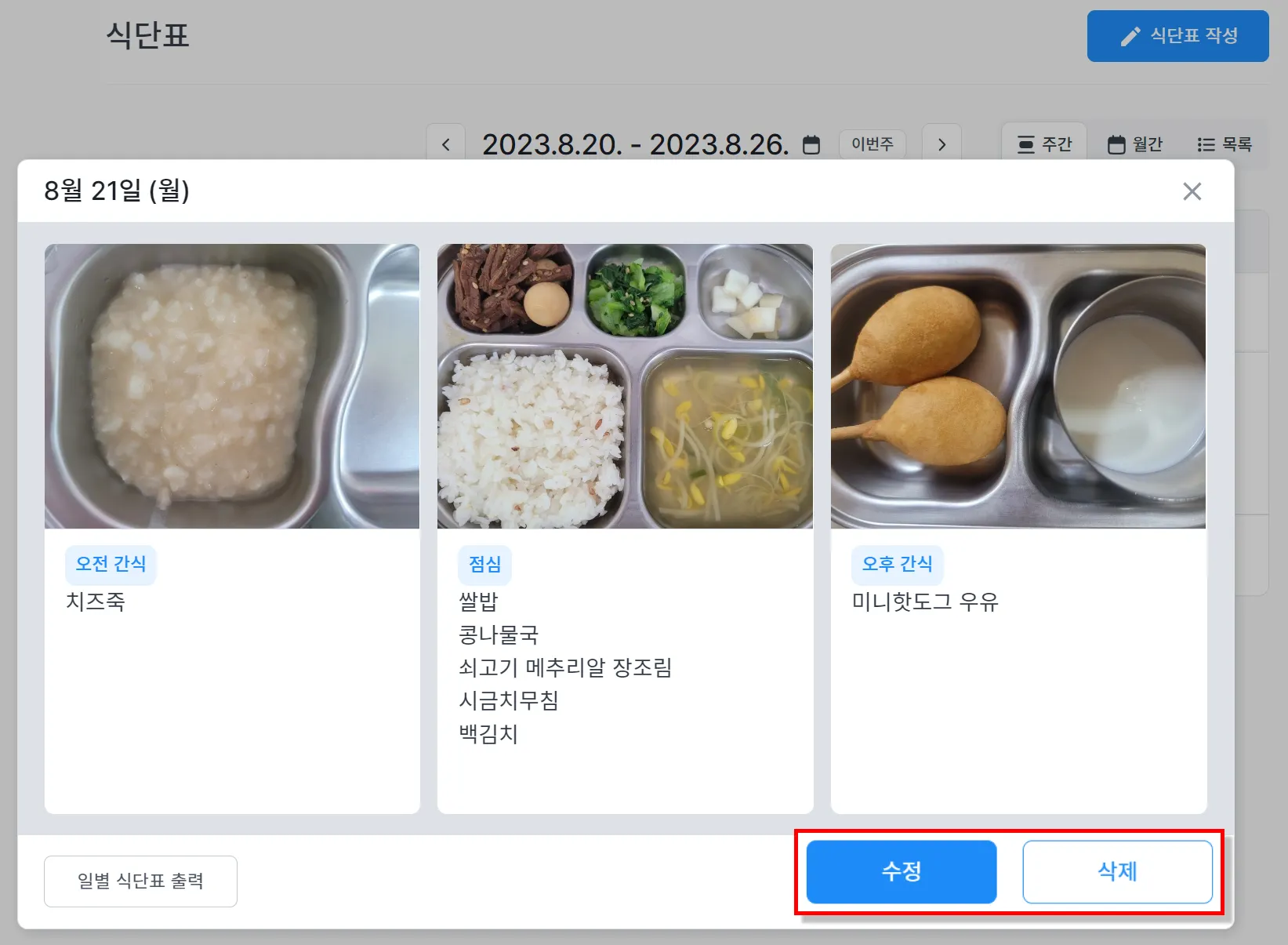 - 목록형 식단표 : 일자별로 수정·삭제 버튼을 확인하실 수 있습니다.