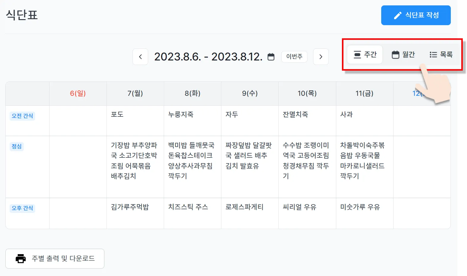 식단표 목록에서 주간/월간/목록별로 식단표를 확인하실 수 있습니다.