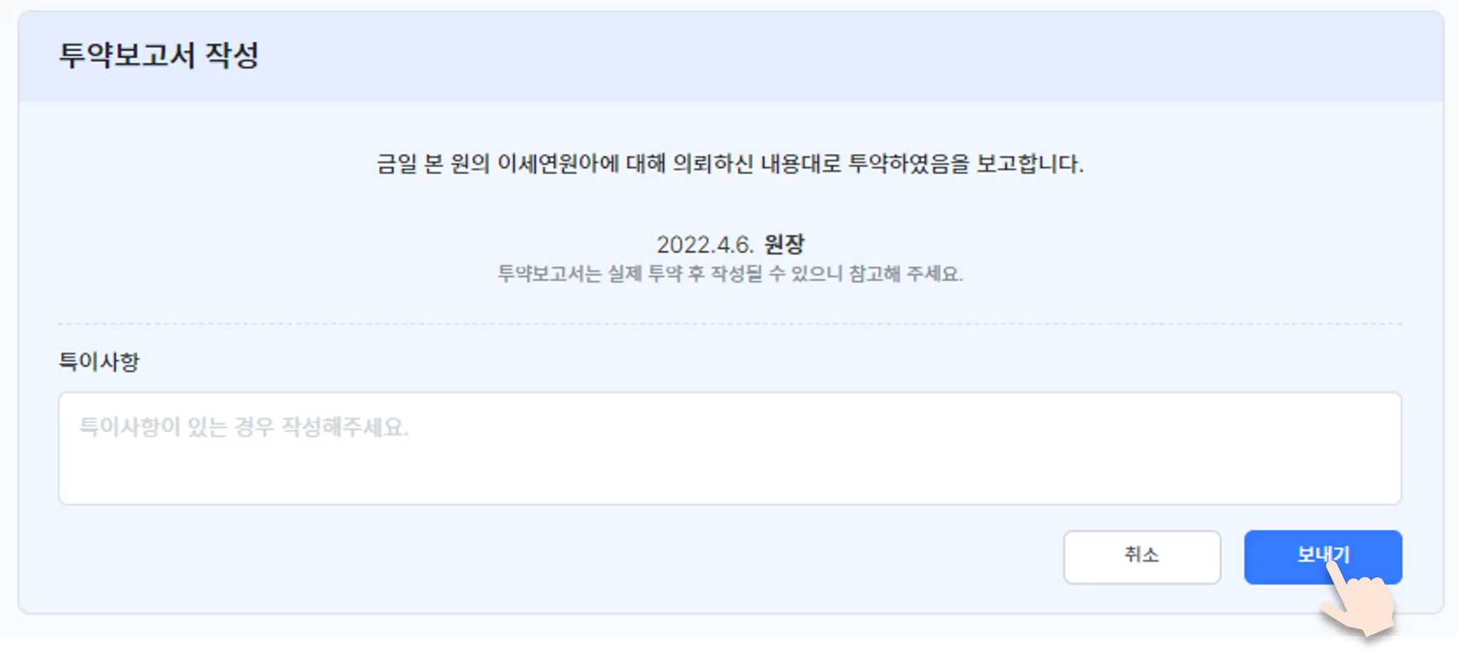 투약보고서 작성이 완료되었다면 보내기 를 선택해주세요. 특이사항은 선택항목이니 꼭 작성하지 않으셔도 됩니다.