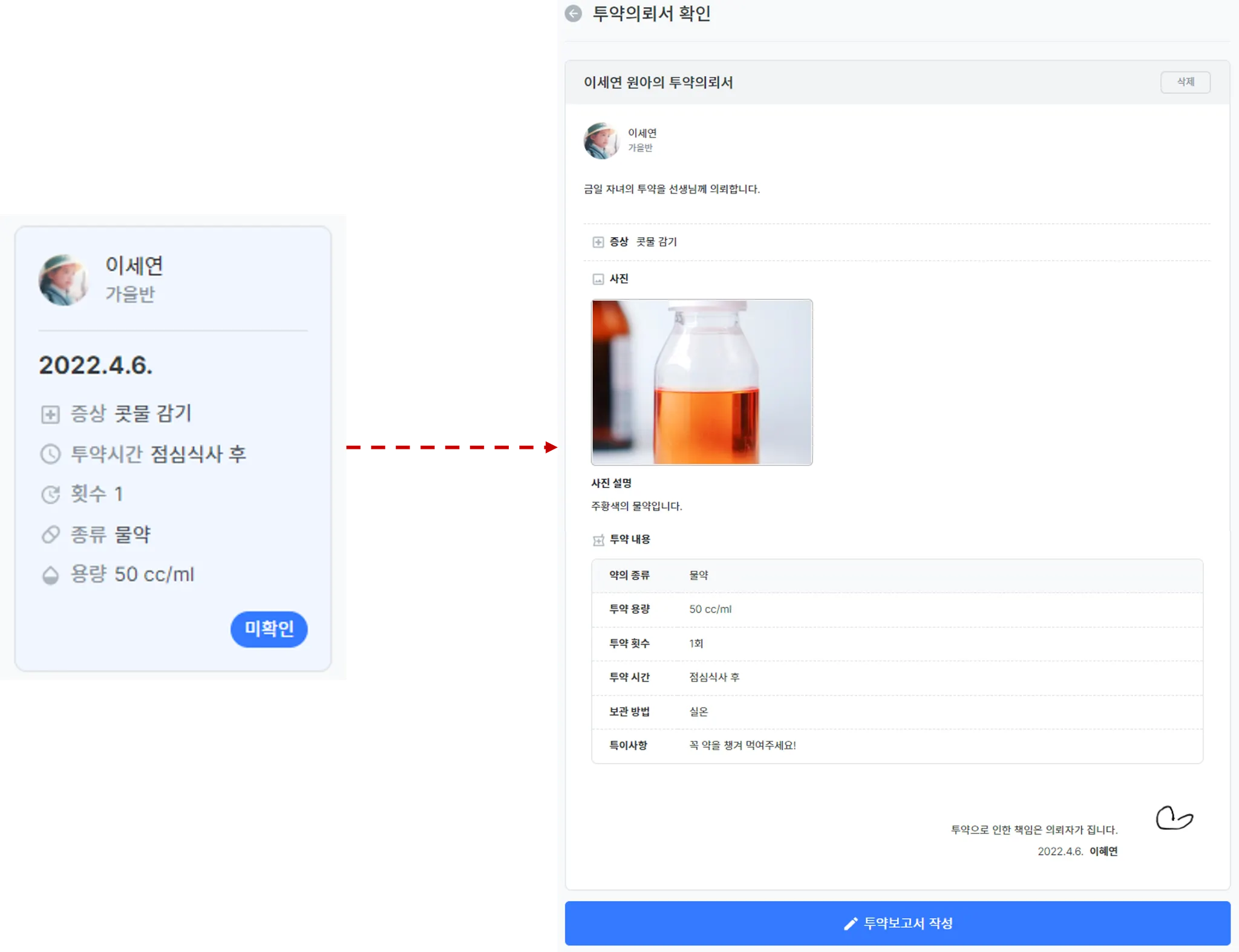 - 투약의뢰서를 클릭하면 부모가 작성한 투약의뢰서 내용을 자세히 확인할 수 있습니다.