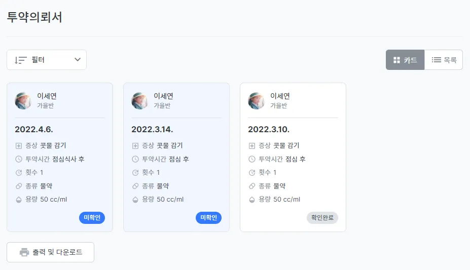 - 필터를 이용하여 반 별, 원아별, 날짜별 투약의뢰서를 볼 수 있습니다.