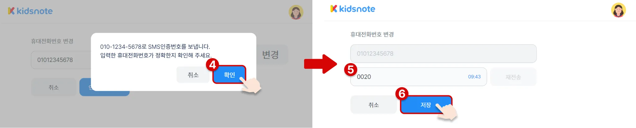정확한 휴대전화번호 확인 후, ④확인 버튼을 선택 > SNS로 발송된 4자리 ⑤인증번호 입력 > ⑥저장 버튼을 누르면 변경이 완료됩니다.
