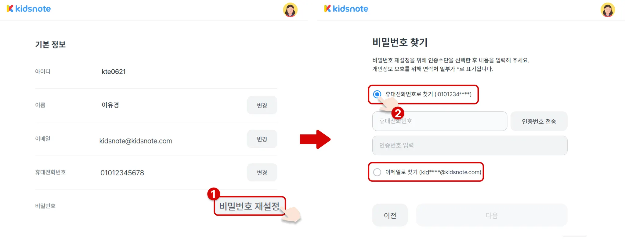 비밀번호 변경을 원하시면 ①비밀번호 재설정 버튼을 선택 > ②휴대전화번호 찾기/이메일로 찾기 2가지 인증 수단 중 원하는 인증 방법을 선택합니다.